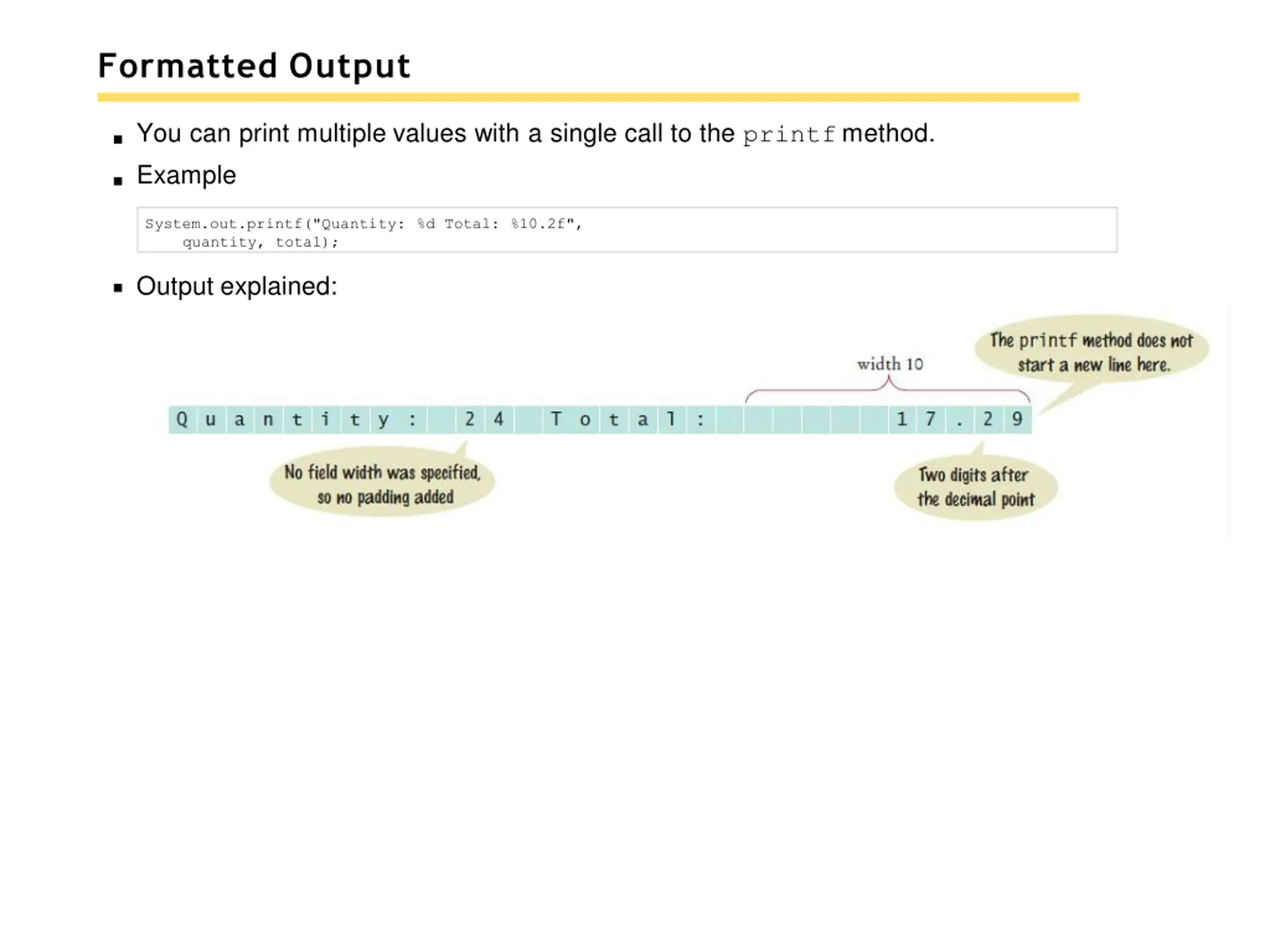 Formatted Output You can print multiple values with a single call to the printf method. Example System.out.printf("Quantity: %d Total: %10.2f", quantity, total); Output explained: