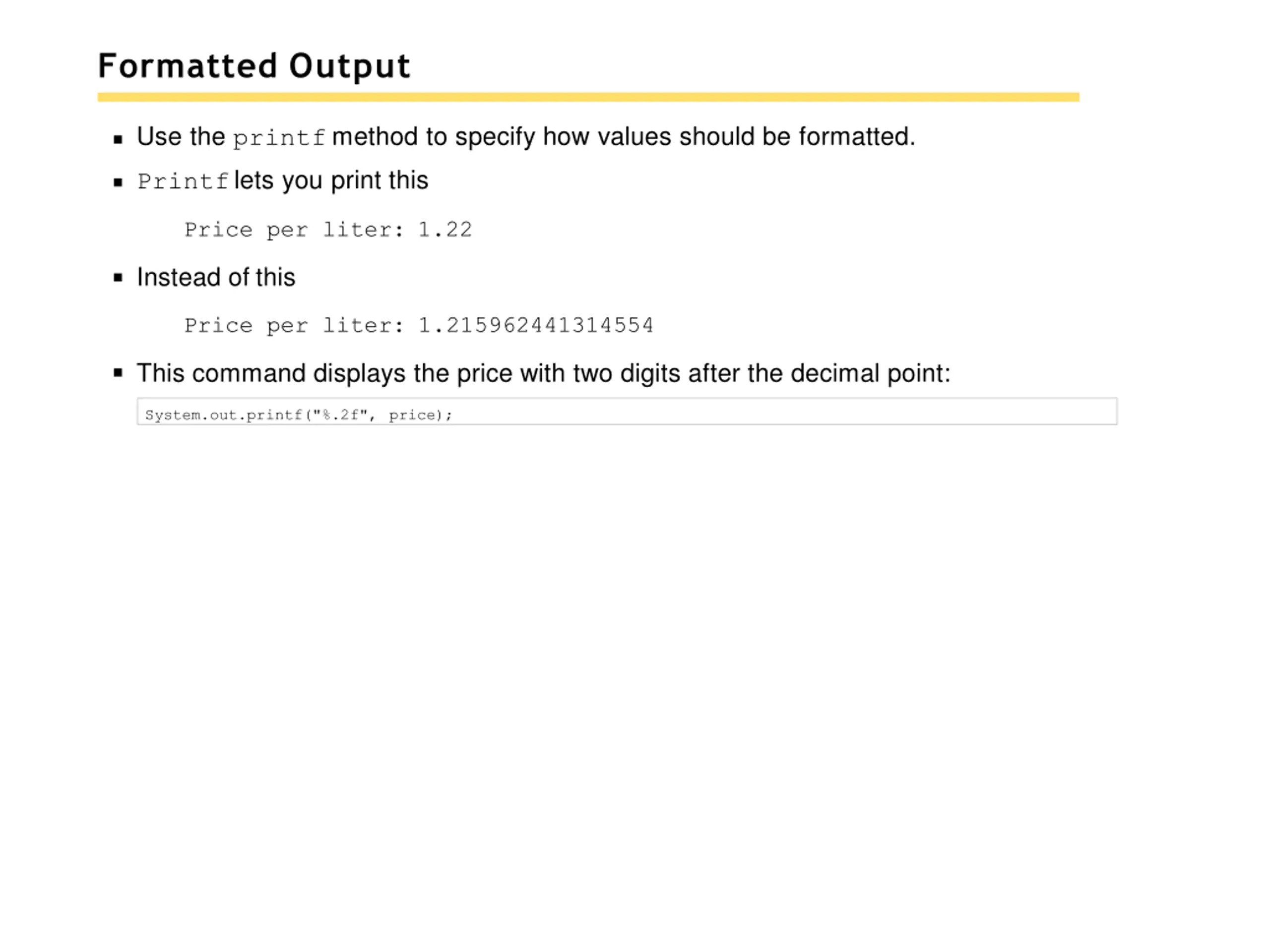 Formatted Output Use the printf method to specify how values should be formatted. Printflets you print this Price per liter: 1.22 Instead of this Price per liter: 1.215962441314554 This command displays the price with two digits after the decimal point: System.out.printf("%.2f", price);