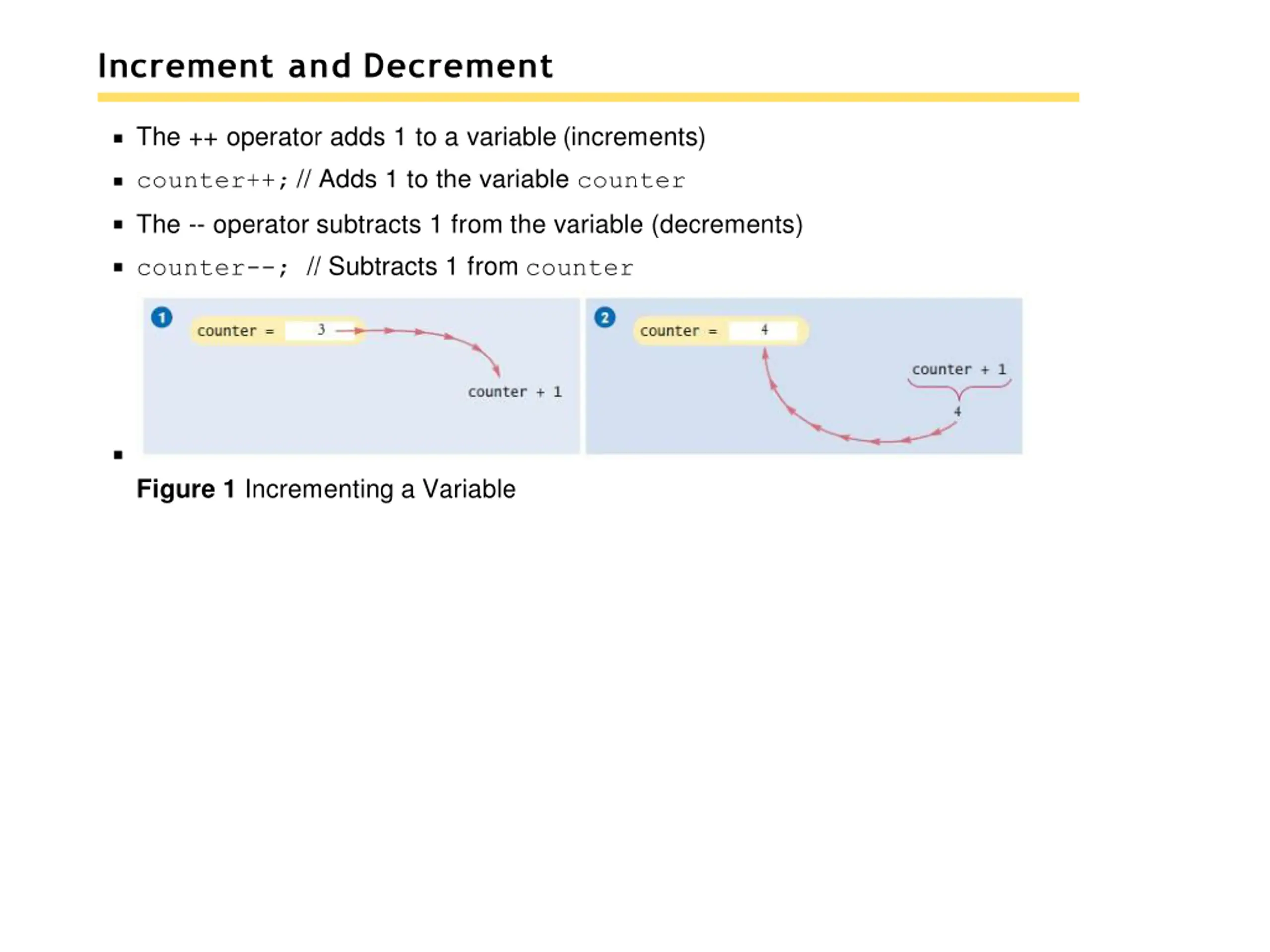 Increment and Decrement The ++ operator adds 1 to a variable (increments) counter++;// Adds 1 to the variable counter The -- operator subtracts 1 from the variable (decrements) counter--; // Subtracts 1 from counter Figure 1 Incrementing a Variable
