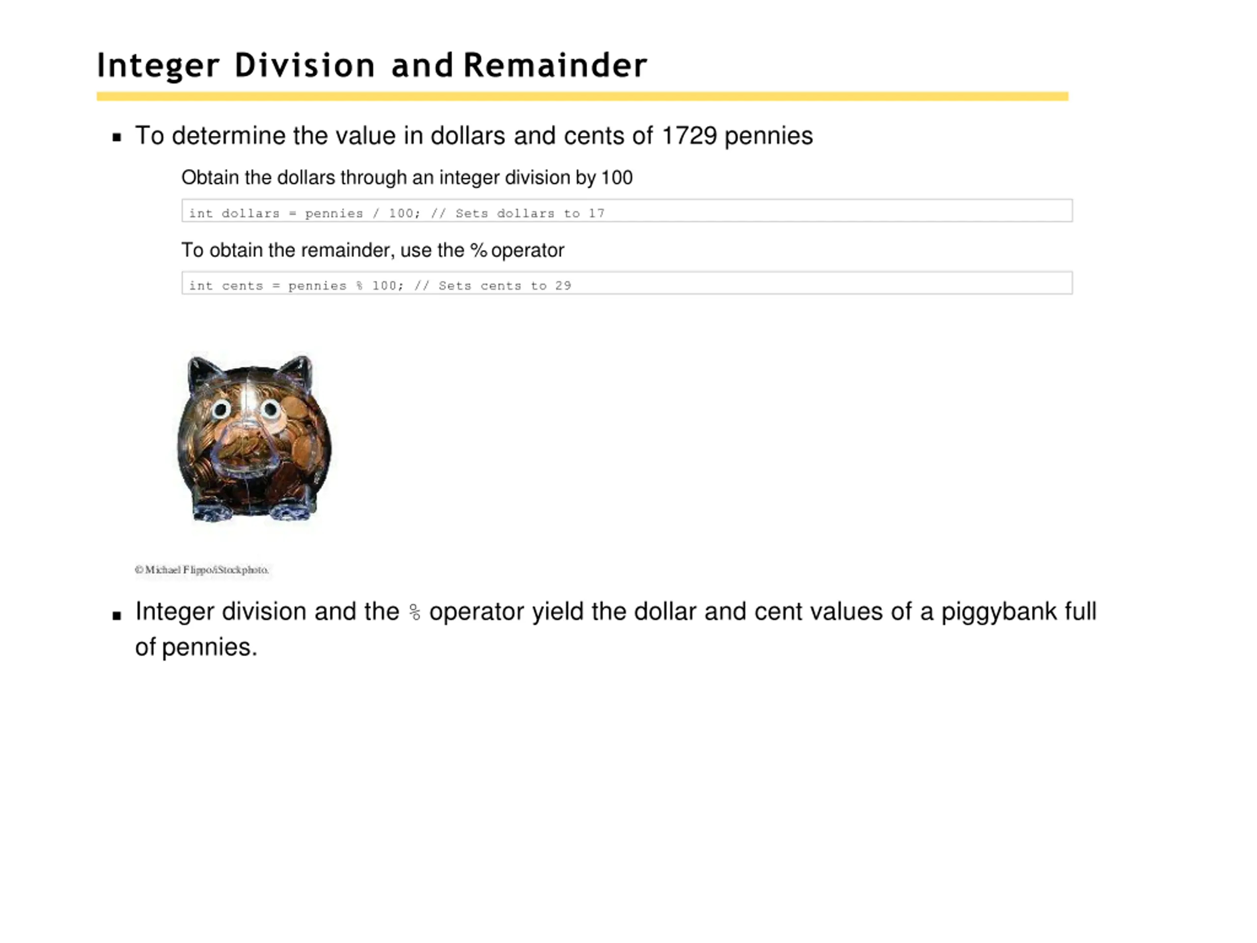 Integer Division and Remainder To determine the value in dollars and cents of 1729 pennies Obtain the dollars through an integer division by100 int dollars = pennies / 100; // Sets dollars to 17 To obtain the remainder, use the %operator int cents = pennies % 100; // Sets cents to 29 Integer division and the % operator yield the dollar and cent values of a piggybank full of pennies.
