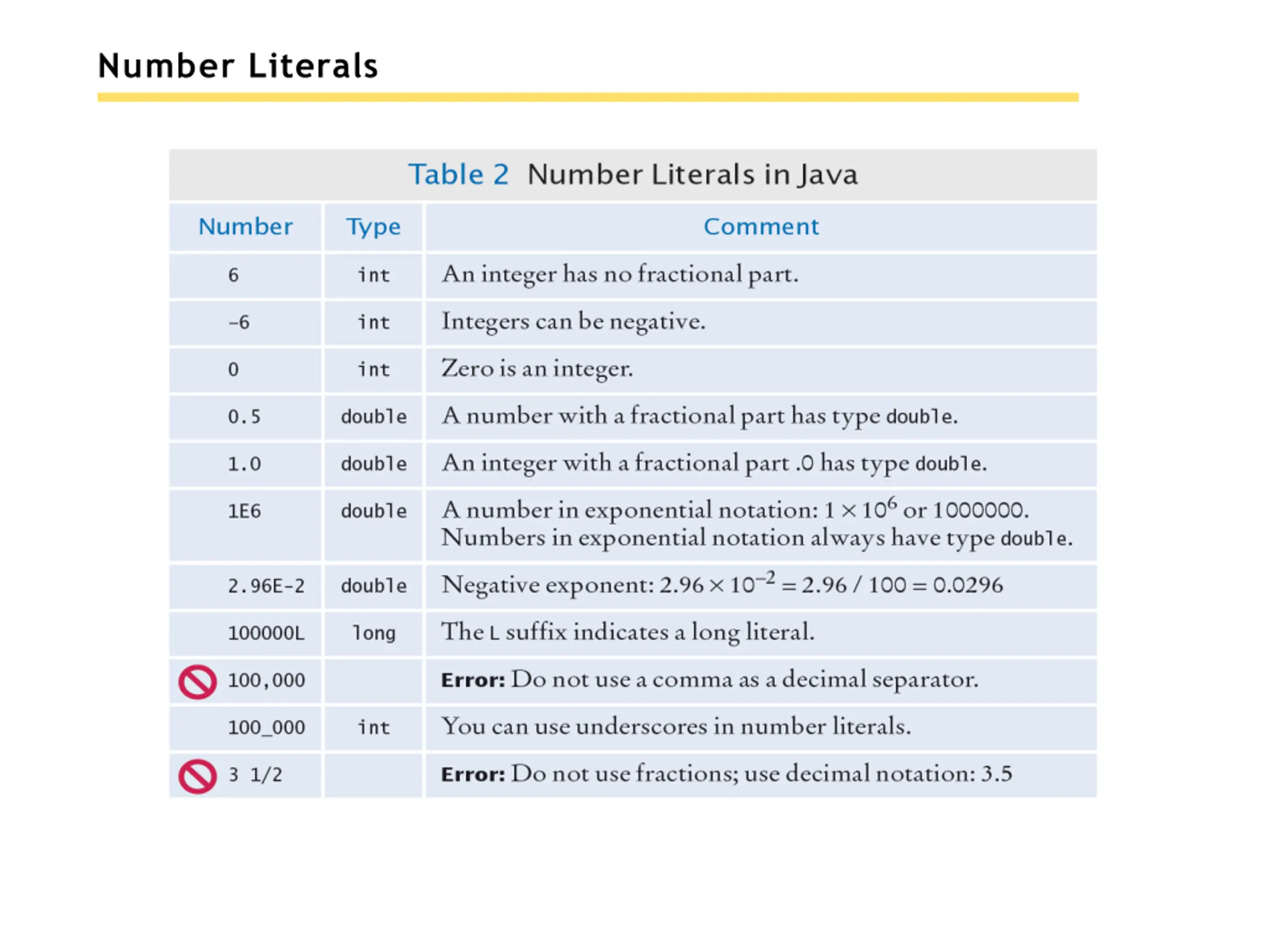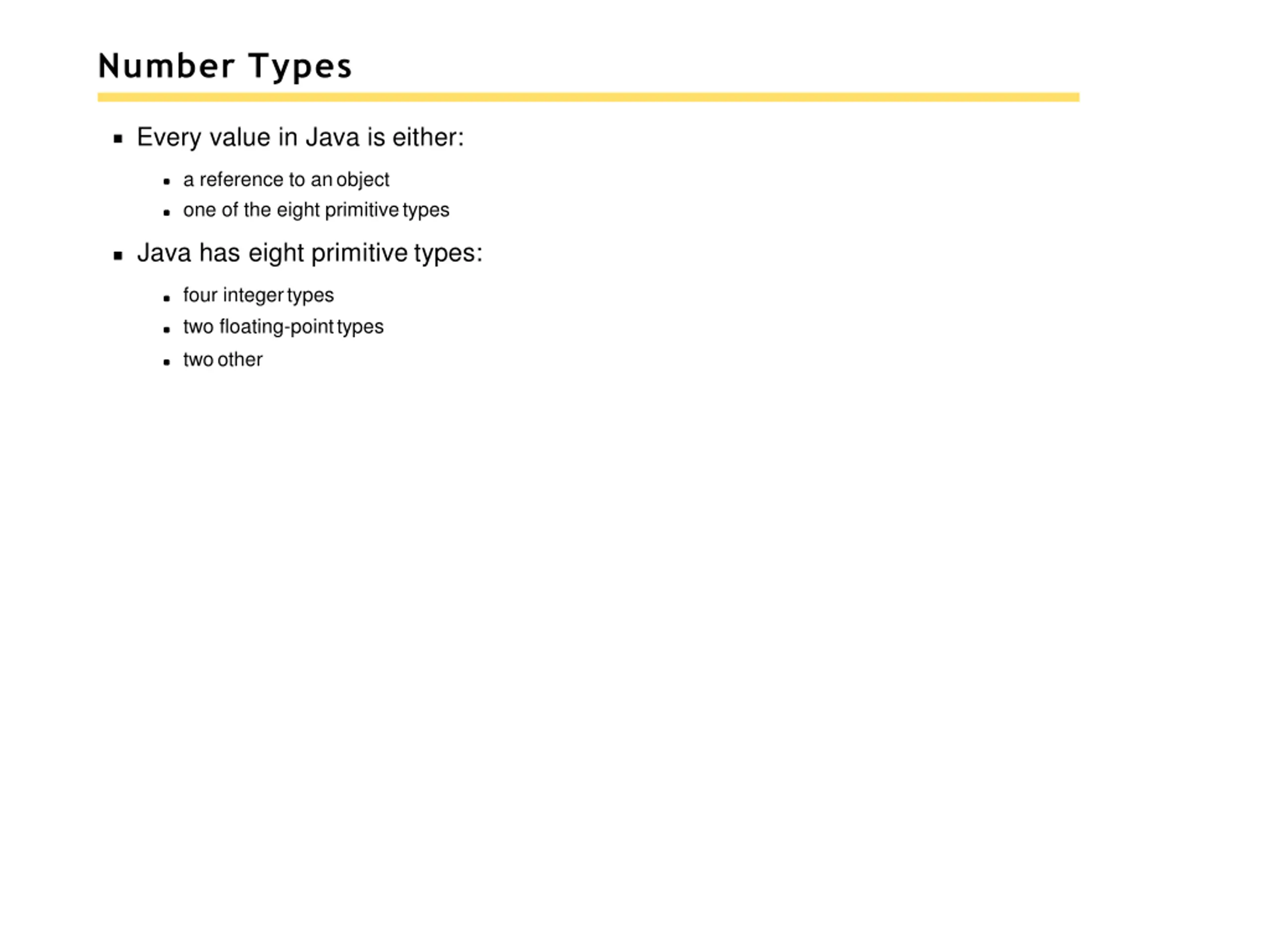 Number Types Every value in Java is either: a reference to anobject one of the eight primitivetypes Java has eight primitive types: four integertypes two floating-pointtypes twoother