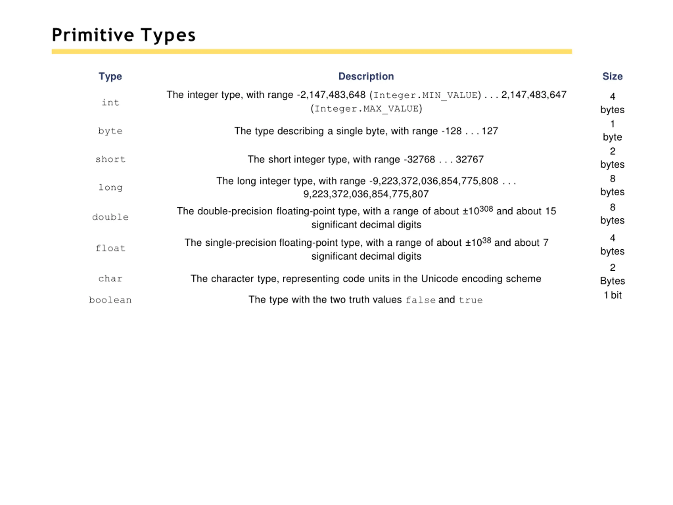 Primitive Types Type Description Size The integer type, with range -2,147,483,648 (Integer.MIN_VALUE) . . . 2,147,483,647 (Integer.MAX_VALUE) 4 int bytes 1 byte 2 bytes 8 bytes 8 bytes The type describing a single byte, with range -128 . . . 127 byte The short integer type, with range -32768 . . . 32767 short The long integer type, with range -9,223,372,036,854,775,808 . . . 9,223,372,036,854,775,807 The double-precision floating-point type, with a range of about 10308 and about 15 significant decimal digits long double 4 The single-precision floating-point type, with a range of about 1038 and about 7 significant decimal digits float bytes 2 Bytes 1bit The character type, representing code units in the Unicode encoding scheme char The type with the two truth values false and true boolean