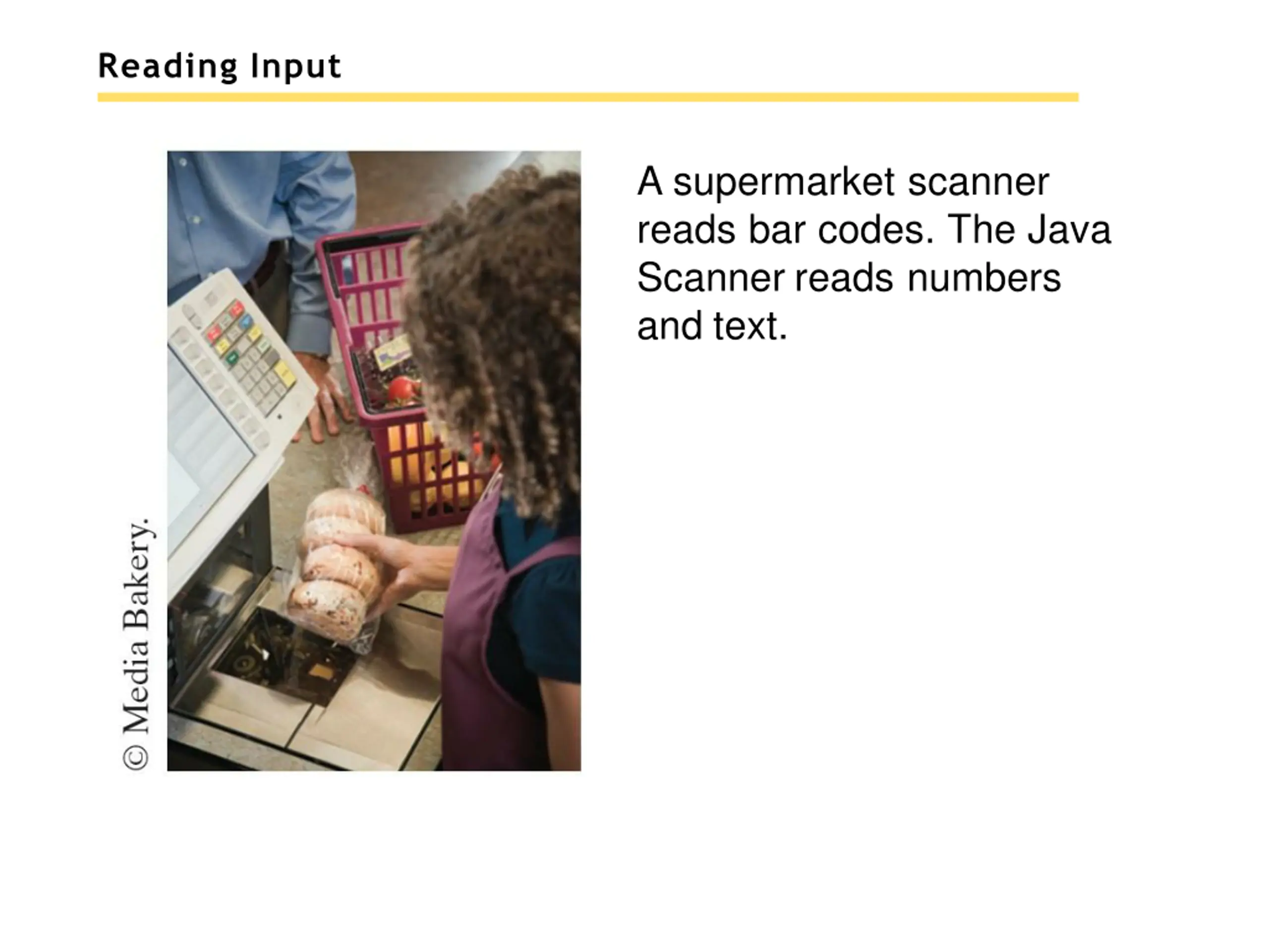 Reading Input A supermarket scanner reads bar codes. The Java Scanner reads numbers and text.