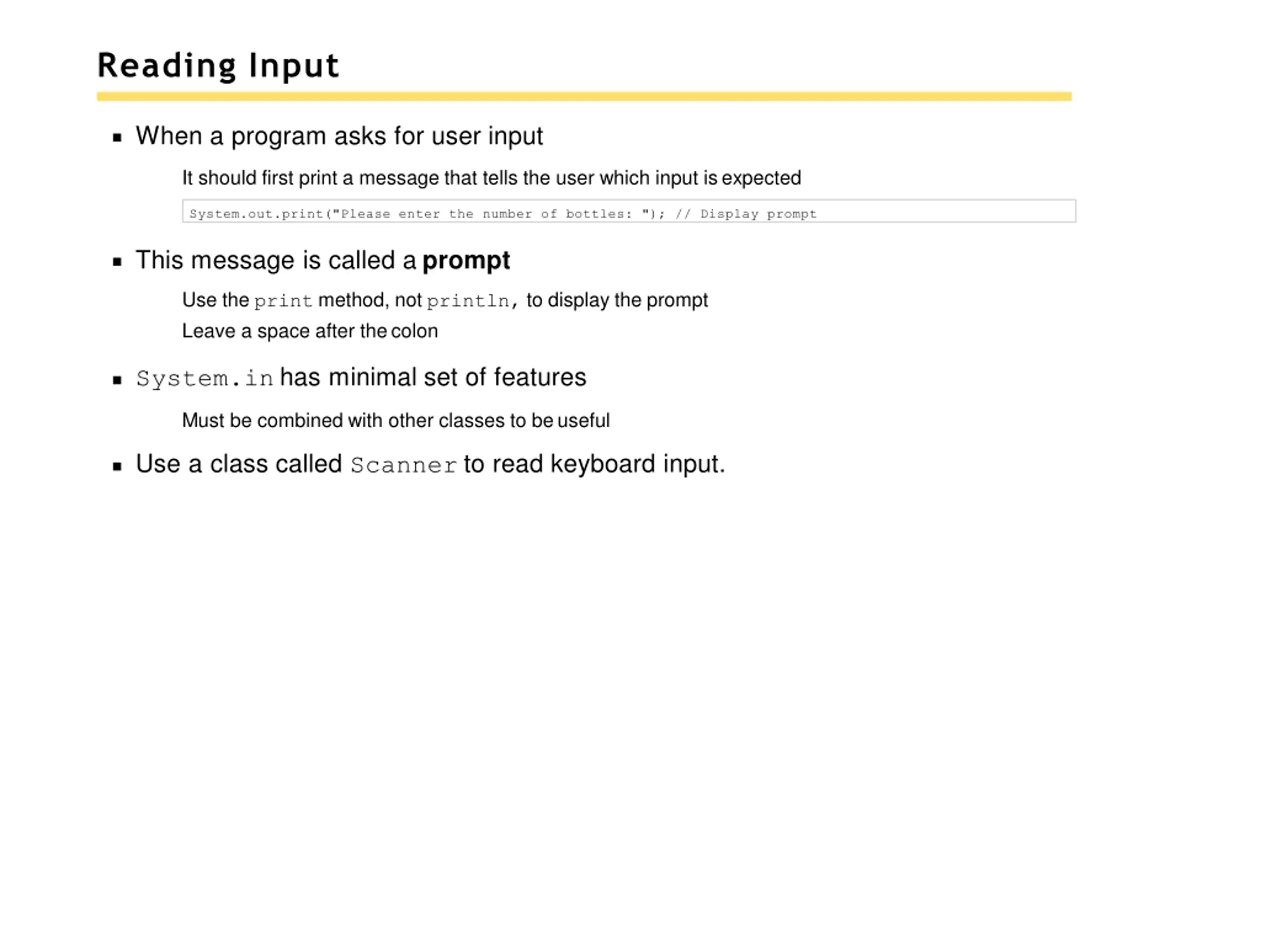 Reading Input When a program asks for user input It should first print a message that tells the user which input isexpected System.out.print("Please enter the number of bottles: "); // Display prompt This message is called a prompt Use the print method, not println, to display the prompt Leave a space after thecolon System.in has minimal set of features Must be combined with other classes to beuseful Use a class called Scanner to read keyboard input.