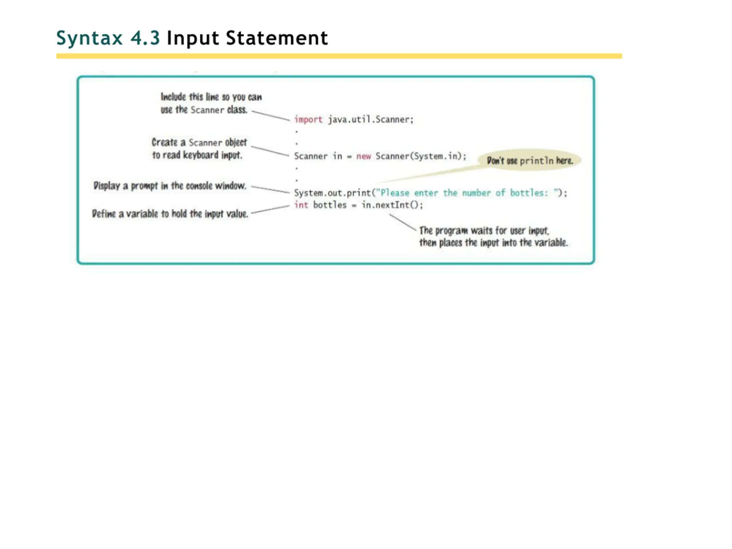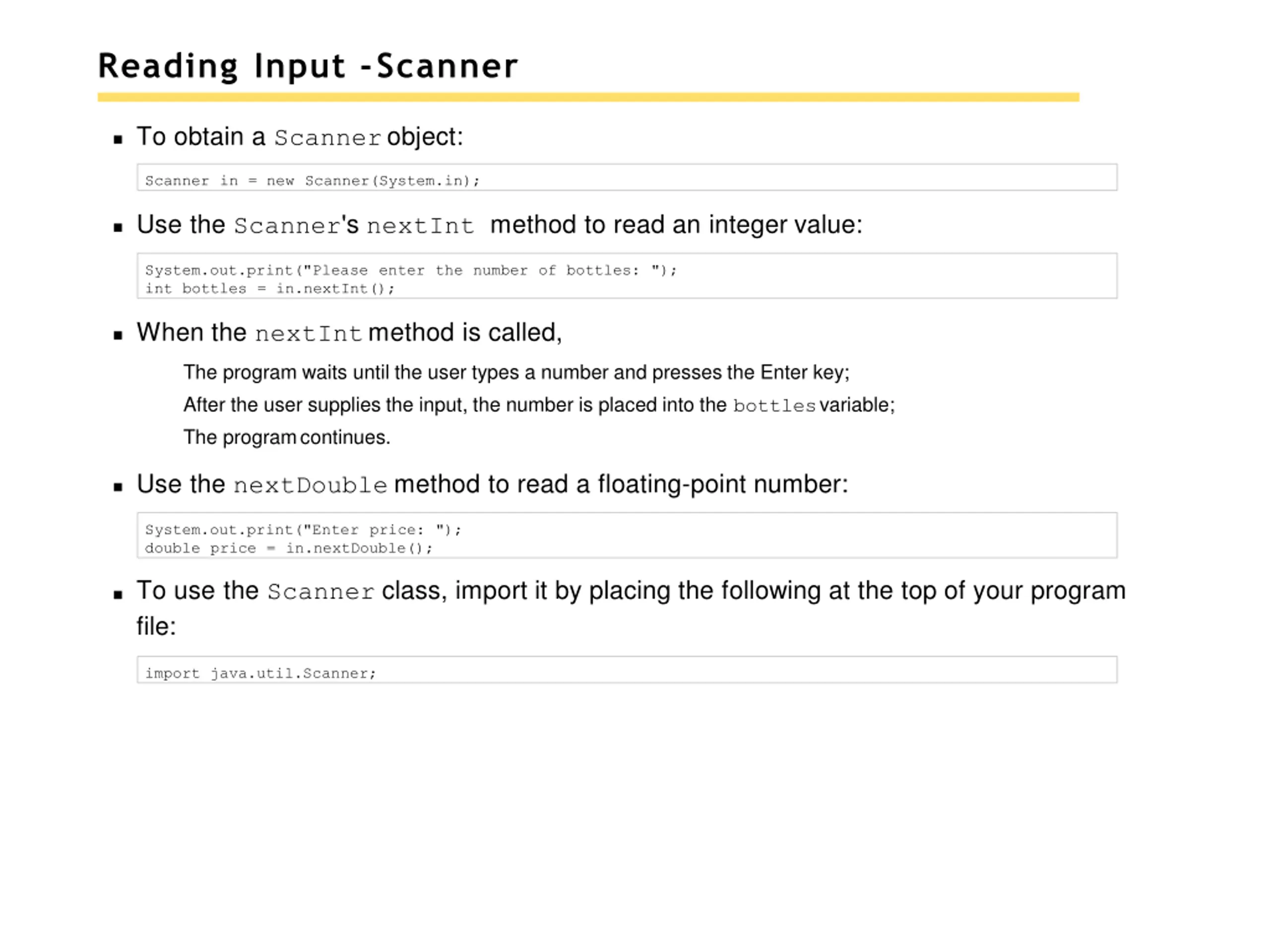 Reading Input -Scanner To obtain a Scannerobject: Scanner in = new Scanner(System.in); Use the Scanner's nextInt method to read an integer value: System.out.print("Please enter the number of bottles: "); int bottles = in.nextInt(); When the nextIntmethod is called, The program waits until the user types a number and presses the Enter key; After the user supplies the input, the number is placed into the bottlesvariable; The programcontinues. Use the nextDouble method to read a floating-point number: System.out.print("Enter price: "); double price = in.nextDouble(); To use the Scanner class, import it by placing the following at the top of your program file: import java.util.Scanner;