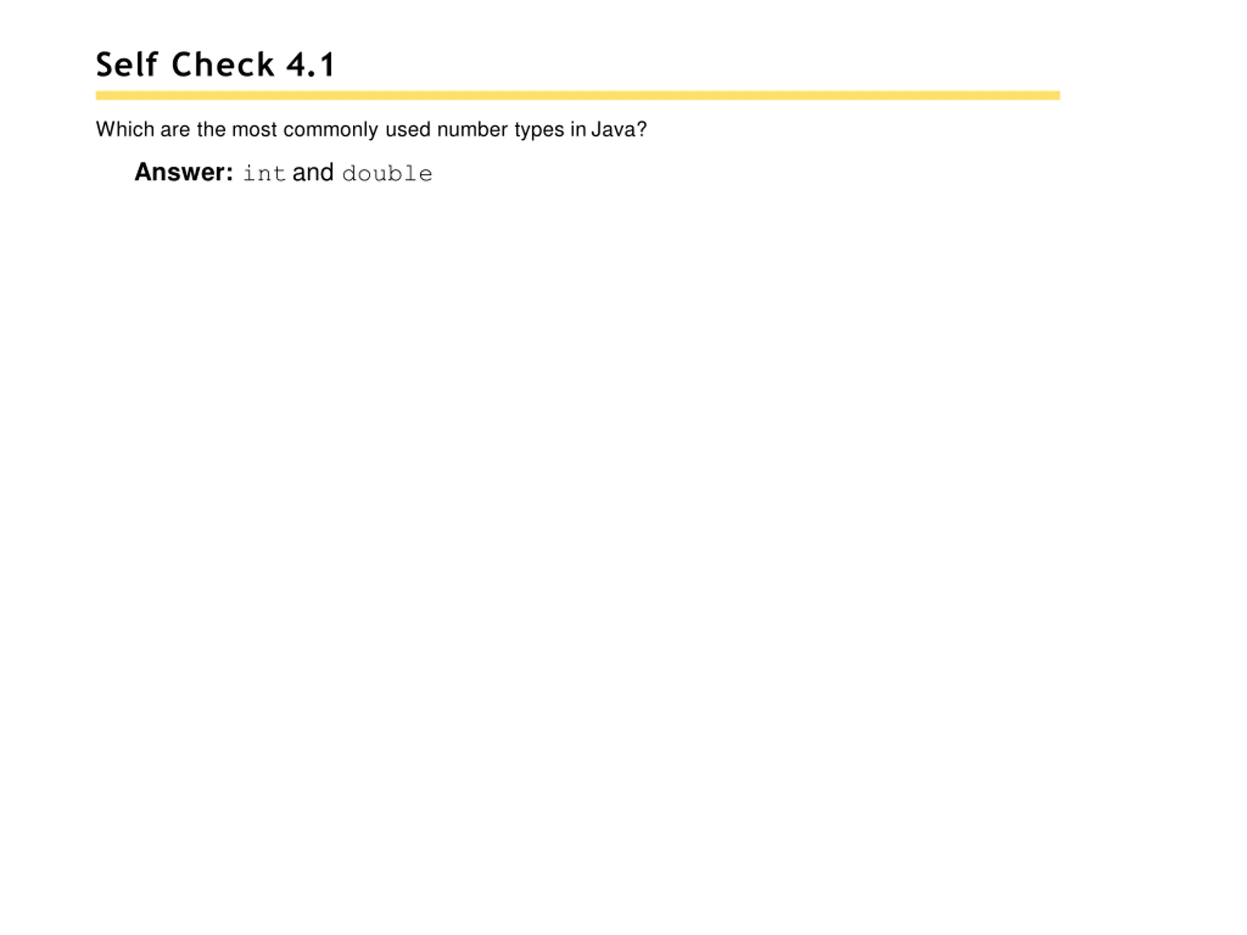 Self Check 4.1 Which are the most commonly used number types in Java? Answer: intand double