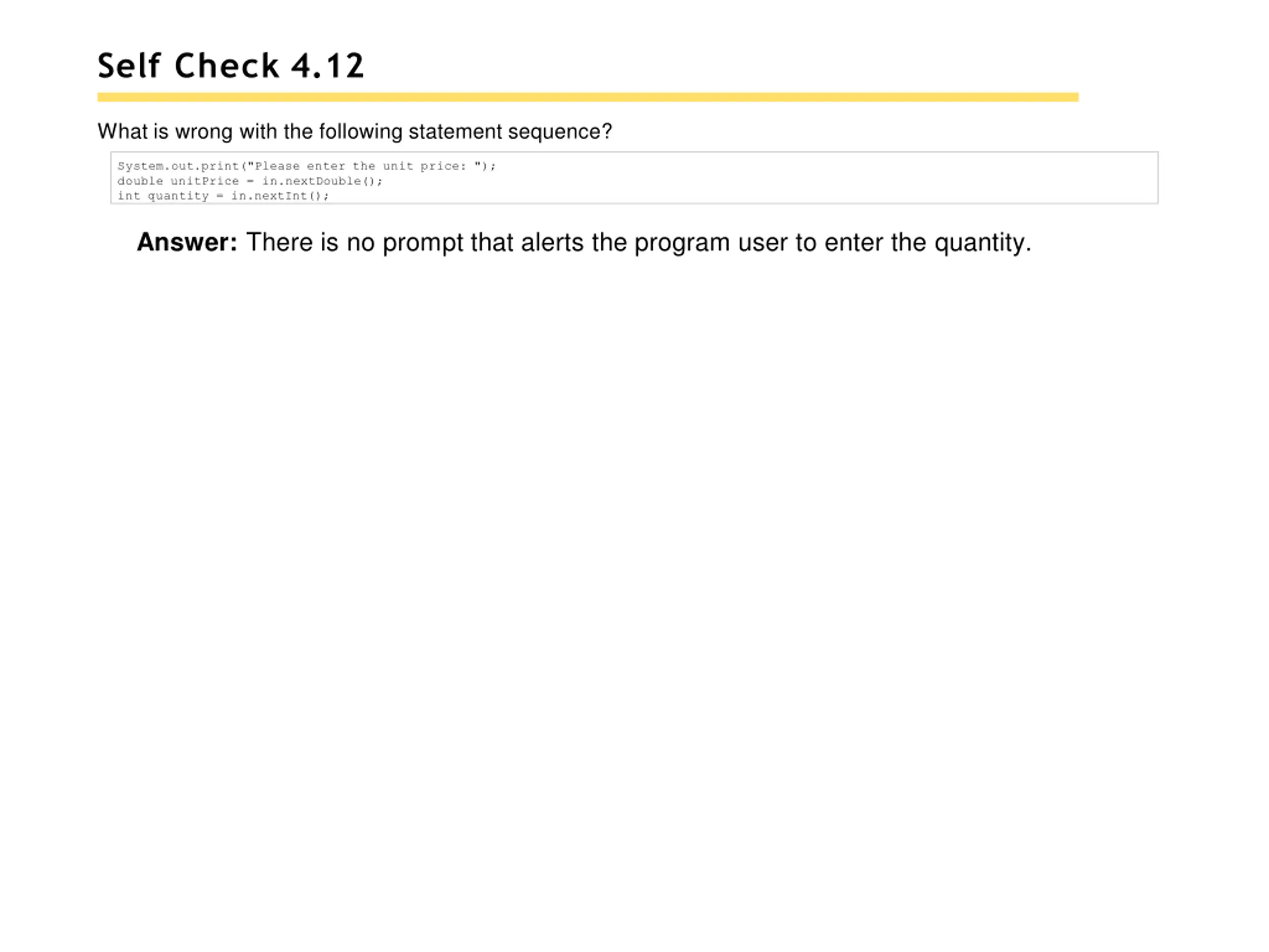 Self Check 4.12 What is wrong with the following statement sequence? System.out.print("Please enter the unit price: "); double unitPrice = in.nextDouble(); int quantity = in.nextInt(); Answer: There is no prompt that alerts the program user to enter the quantity.