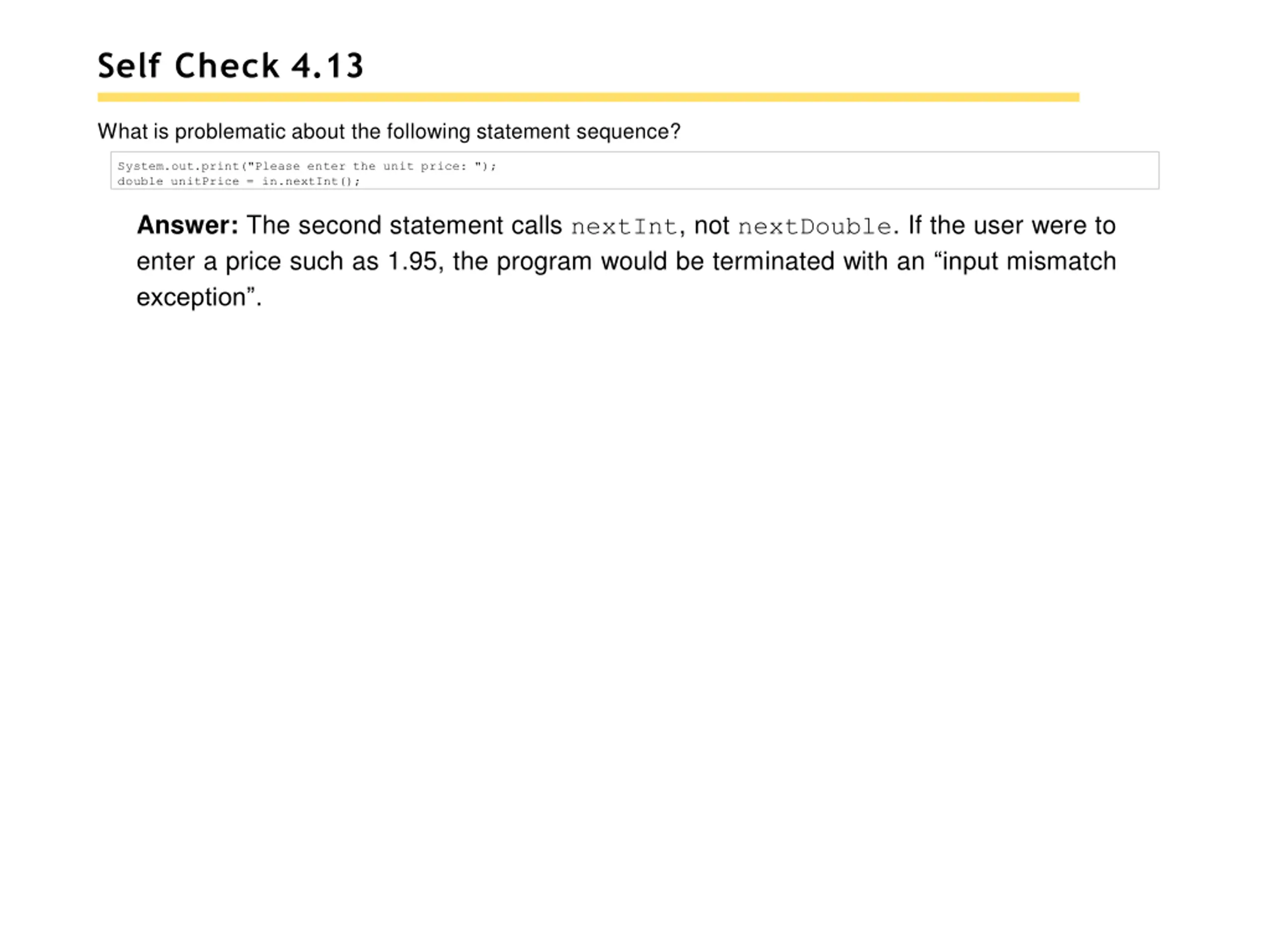 Self Check 4.13 What is problematic about the following statement sequence? System.out.print("Please enter the unit price: "); double unitPrice = in.nextInt(); Answer: The second statement calls nextInt, not nextDouble. If the user were to enter a price such as 1.95, the program would be terminated with an input mismatch exception .