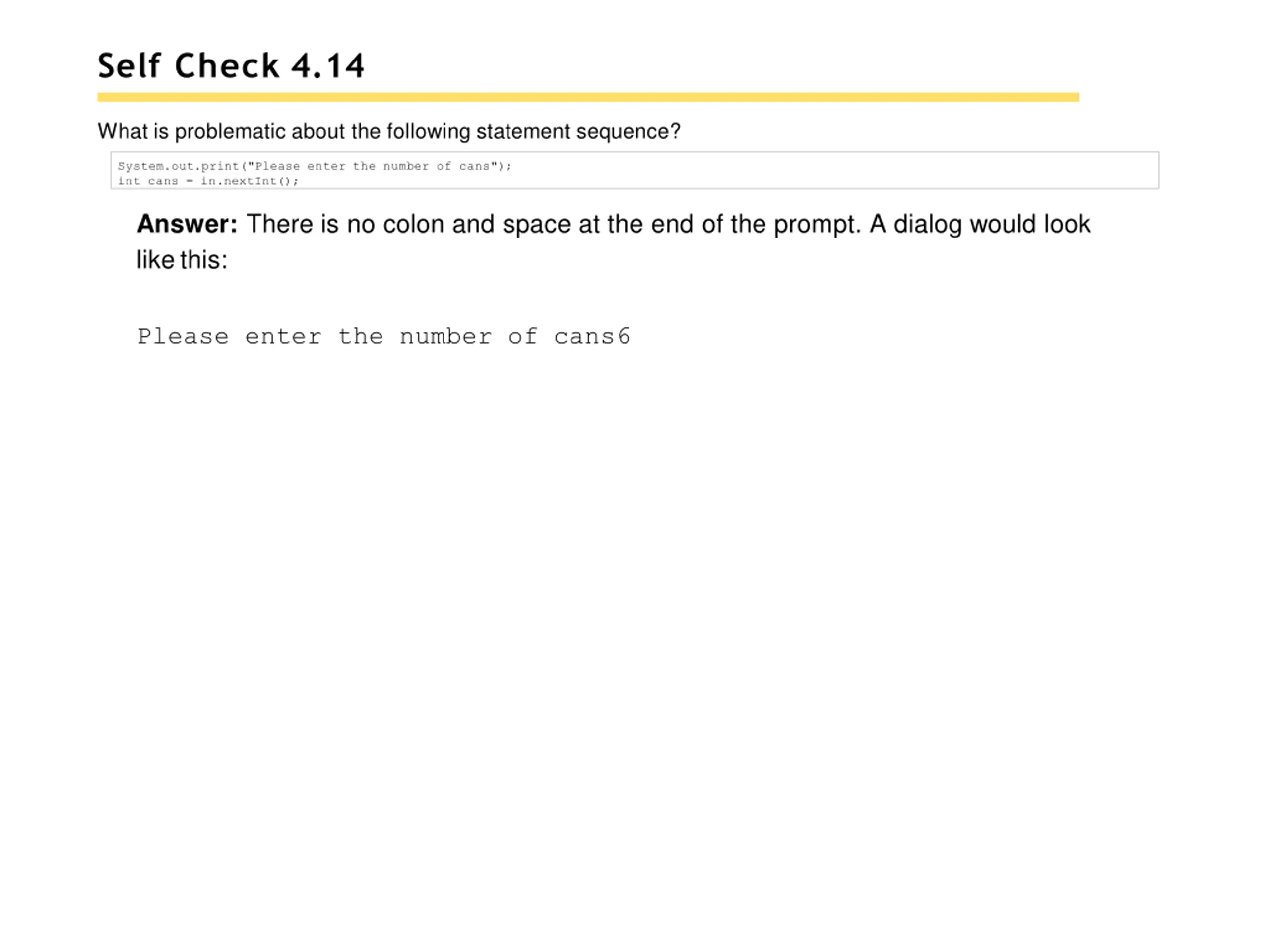 Self Check 4.14 What is problematic about the following statement sequence? System.out.print("Please enter the number of cans"); int cans = in.nextInt(); Answer: There is no colon and space at the end of the prompt. A dialog would look likethis: Please enter the number of cans6