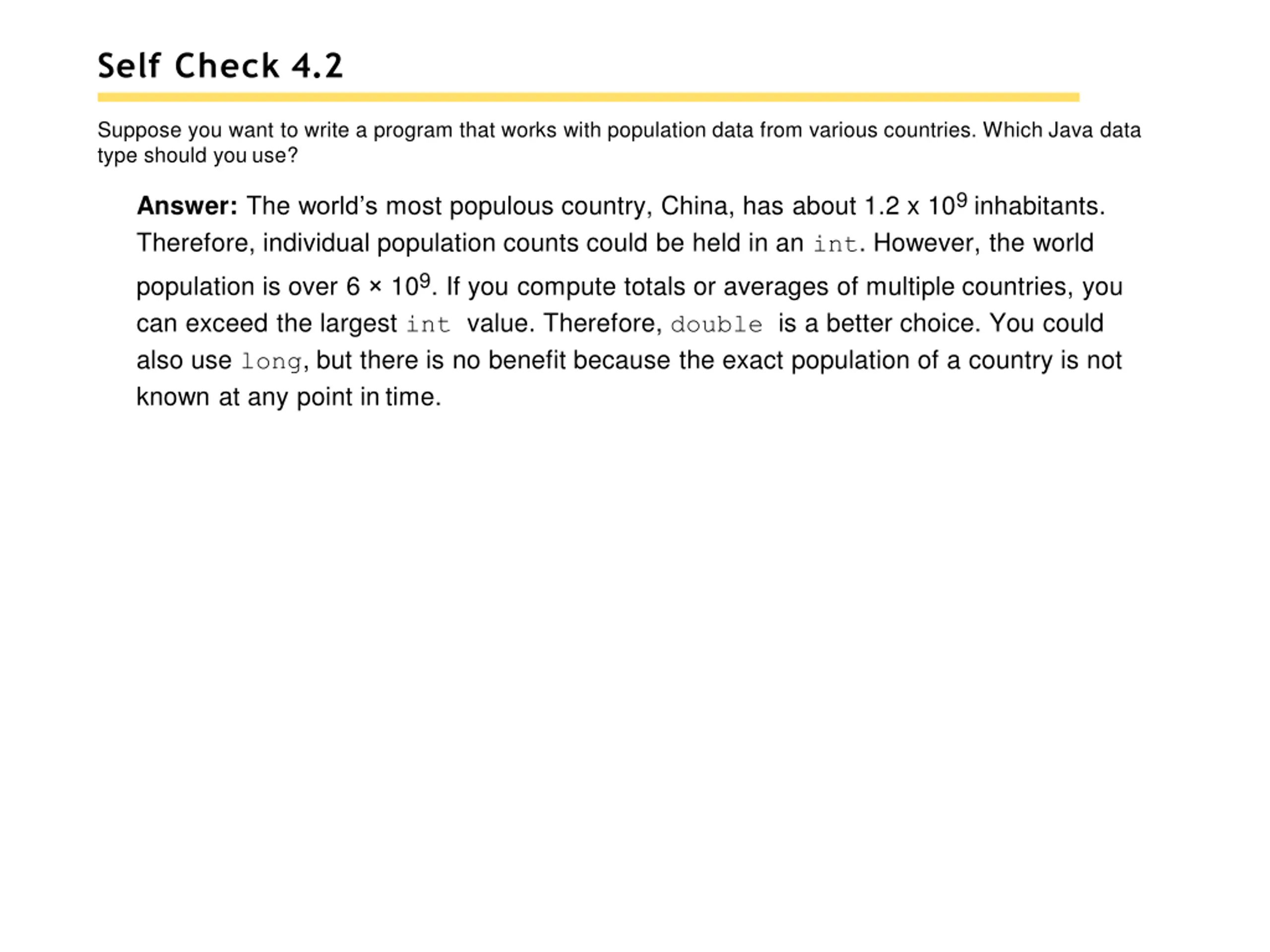 Self Check 4.2 Suppose you want to write a program that works with population data from various countries. Which Java data type should you use? Answer: The world s most populous country, China, has about 1.2 x 109 inhabitants. Therefore, individual population counts could be held in an int. However, the world population is over 6 109. If you compute totals or averages of multiple countries, you can exceed the largest int value. Therefore, double is a better choice. You could also use long, but there is no benefit because the exact population of a country is not known at any point in time.