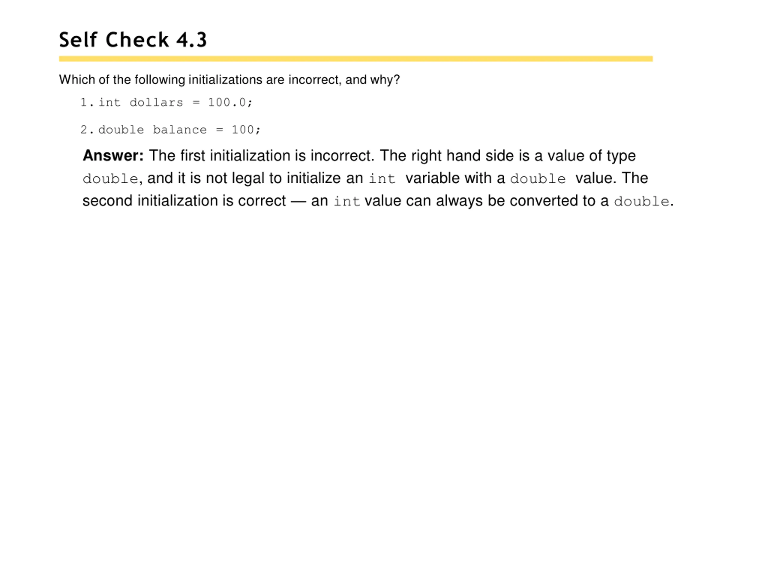 Self Check 4.3 Which of the following initializations are incorrect, and why? 1. int dollars = 100.0; 2. double balance = 100; Answer: The first initialization is incorrect. The right hand side is a value of type double, and it is not legal to initialize an int variable with a double value. The second initialization is correct an int value can always be converted to a double.