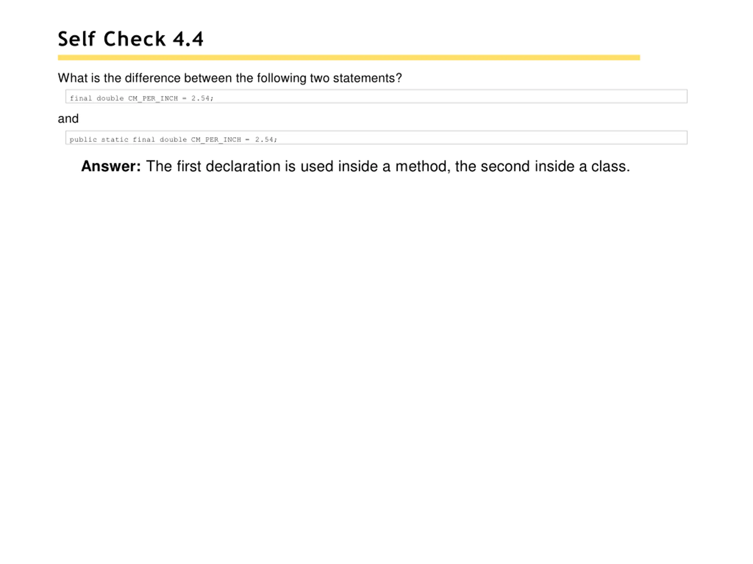 Self Check 4.4 What is the difference between the following two statements? final double CM_PER_INCH = 2.54; and public static final double CM_PER_INCH = 2.54; Answer: The first declaration is used inside a method, the second inside a class.