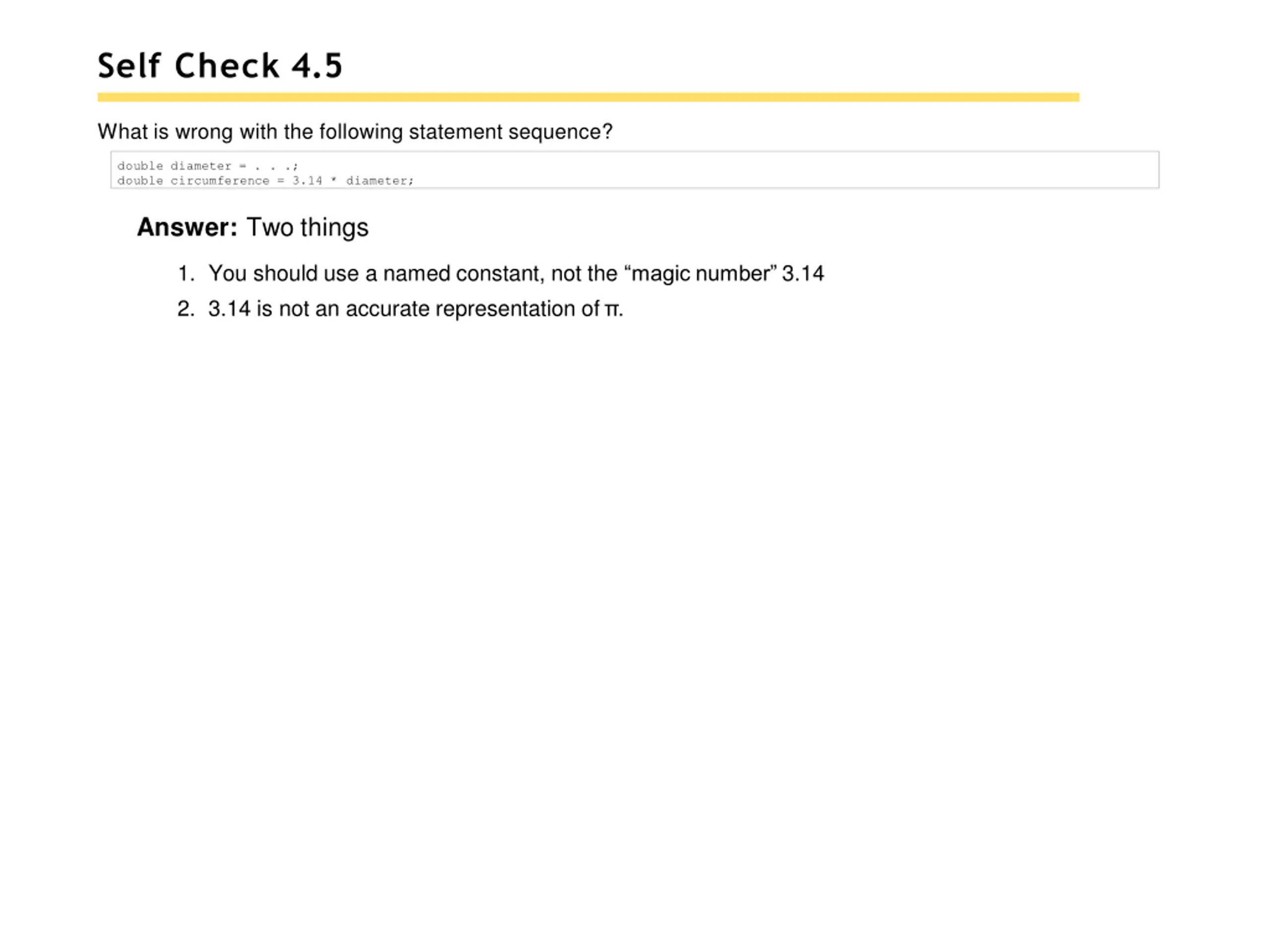 Self Check 4.5 What is wrong with the following statement sequence? double diameter = . . .; double circumference = 3.14 * diameter; Answer: Two things 1. You should use a named constant, not the magic number 3.14 2. 3.14 is not an accurate representation of .