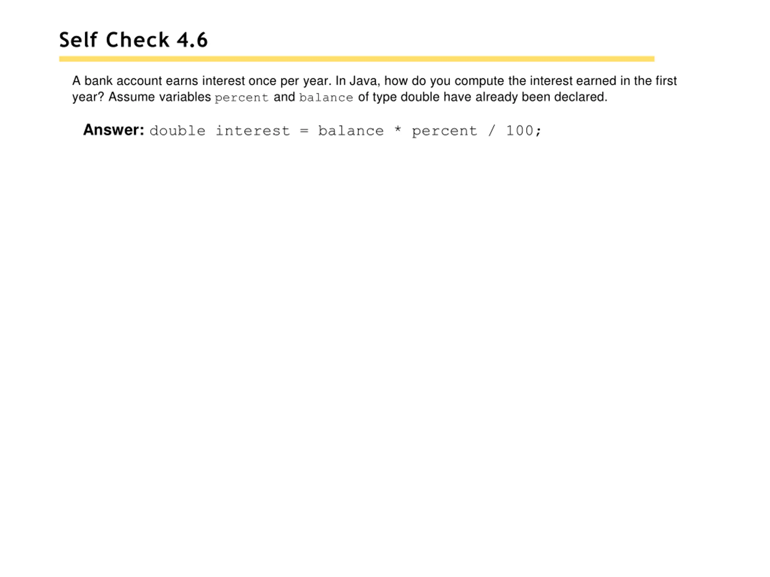 Self Check 4.6 A bank account earns interest once per year. In Java, how do you compute the interest earned in the first year? Assume variables percent and balance of type double have already been declared. Answer: double interest = balance * percent / 100;