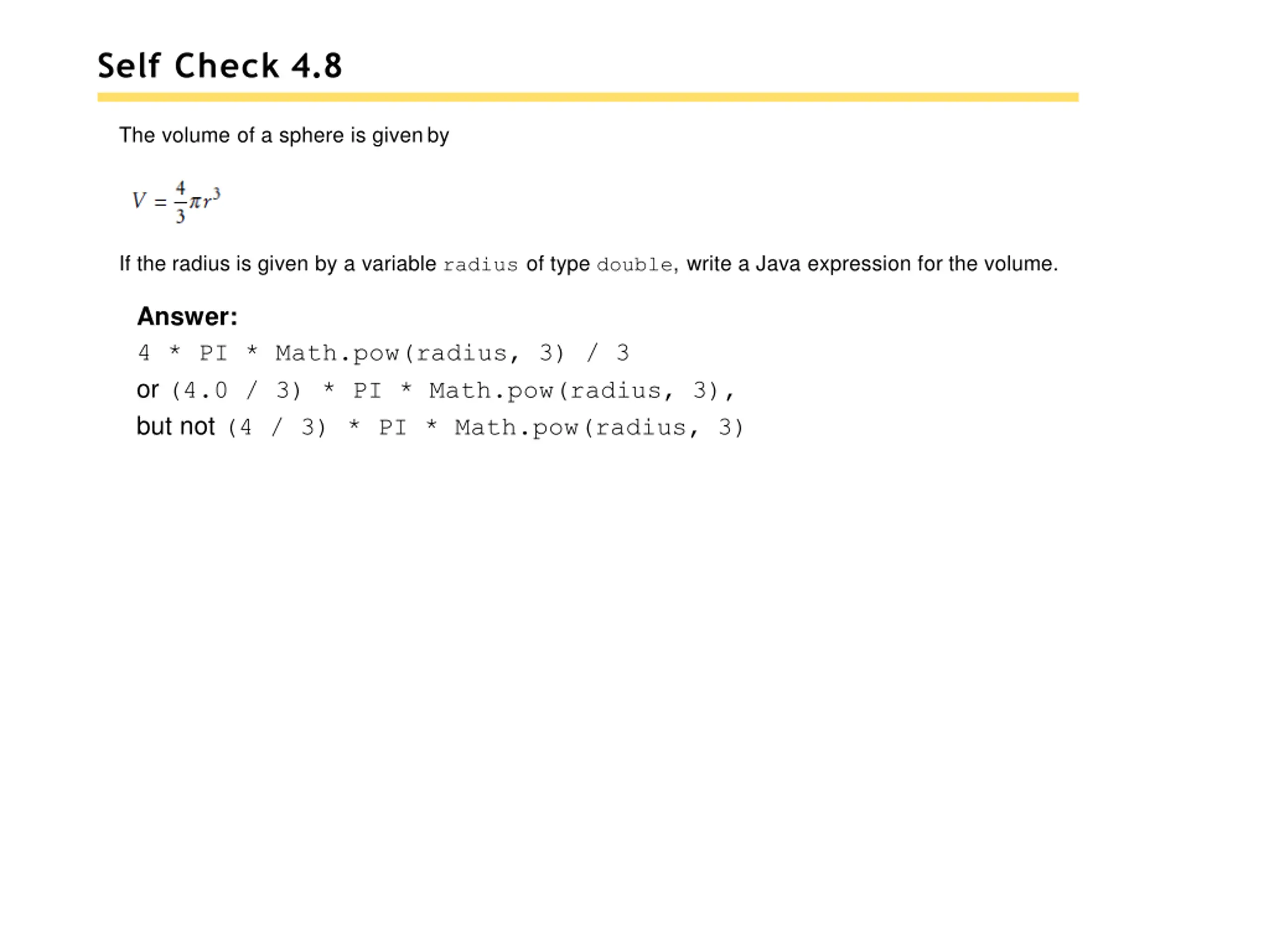 Self Check 4.8 The volume of a sphere is givenby If the radius is given by a variable radius of type double, write a Java expression for the volume. Answer: 4 * PI * Math.pow(radius, 3) / 3 or (4.0 / 3) * PI * Math.pow(radius, 3), but not (4 / 3) * PI * Math.pow(radius, 3)