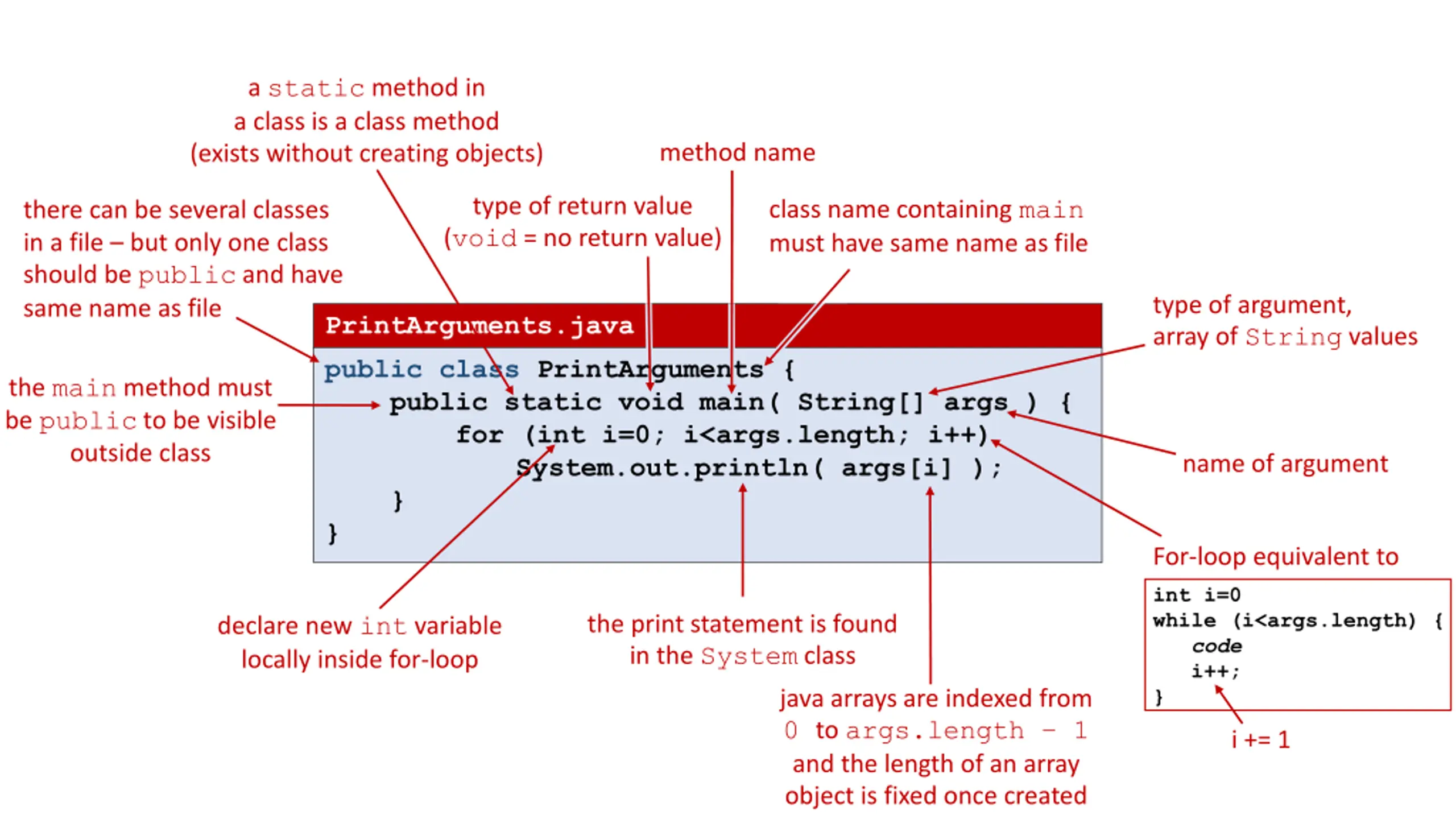 a static method in a class is a class method (exists without creating objects) method name type of return value (void = no return value) class name containing main must have same name as file there can be several classes in a file but only one class should be public and have same name as file type of argument, array of String values PrintArguments.java public class PrintArguments { public static void main( String[] args ) { for (int i=0; i<args.length; i++) System.out.println( args[i] ); } } the main method must be public to be visible outside class name of argument For-loop equivalent to int i=0 while (i<args.length) { code i++; } declare new int variable locally inside for-loop the print statement is found in the System class java arrays are indexed from 0 to args.length 1 and the length of an array object is fixed once created i += 1
