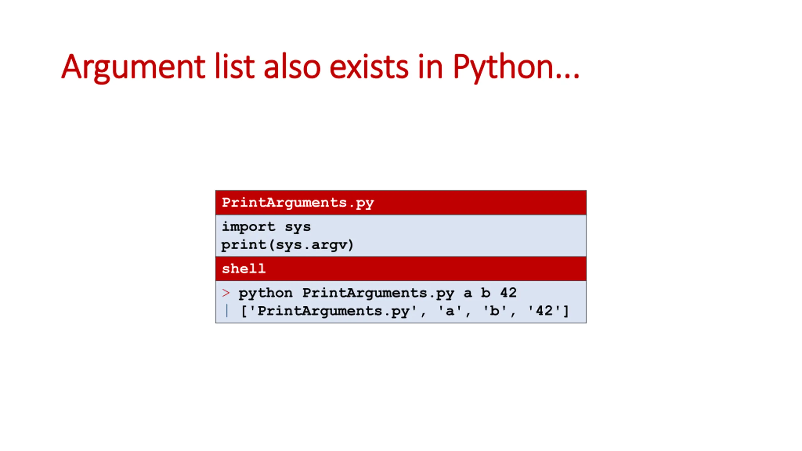 Argument list also exists in Python... Argument list also exists in Python... PrintArguments.py import sys print(sys.argv) shell > python PrintArguments.py a b 42 | ['PrintArguments.py', 'a', 'b', '42']
