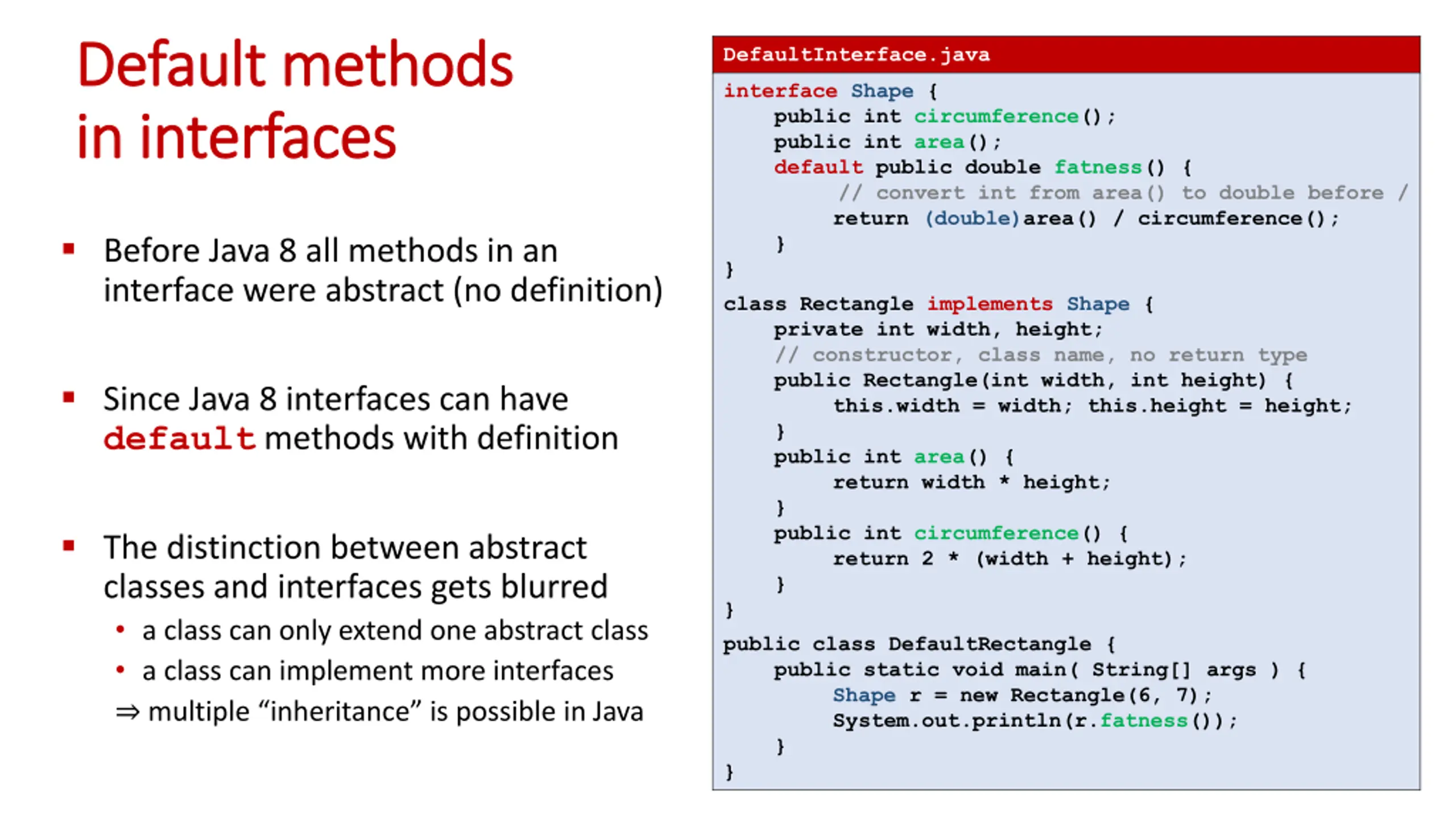 Default Default methods methods in interfaces in interfaces DefaultInterface.java interface Shape { public int circumference(); public int area(); default public double fatness() { // convert int from area() to double before / return (double)area() / circumference(); } } class Rectangle implements Shape { private int width, height; // constructor, class name, no return type public Rectangle(int width, int height) { this.width = width; this.height = height; } public int area() { return width * height; } public int circumference() { return 2 * (width + height); } } public class DefaultRectangle { public static void main( String[] args ) { Shape r = new Rectangle(6, 7); System.out.println(r.fatness()); } } Before Java 8 all methods in an interface were abstract (no definition) Since Java 8 interfaces can have default methods with definition The distinction between abstract classes and interfaces gets blurred a class can only extend one abstract class a class can implement more interfaces multiple inheritance is possible in Java