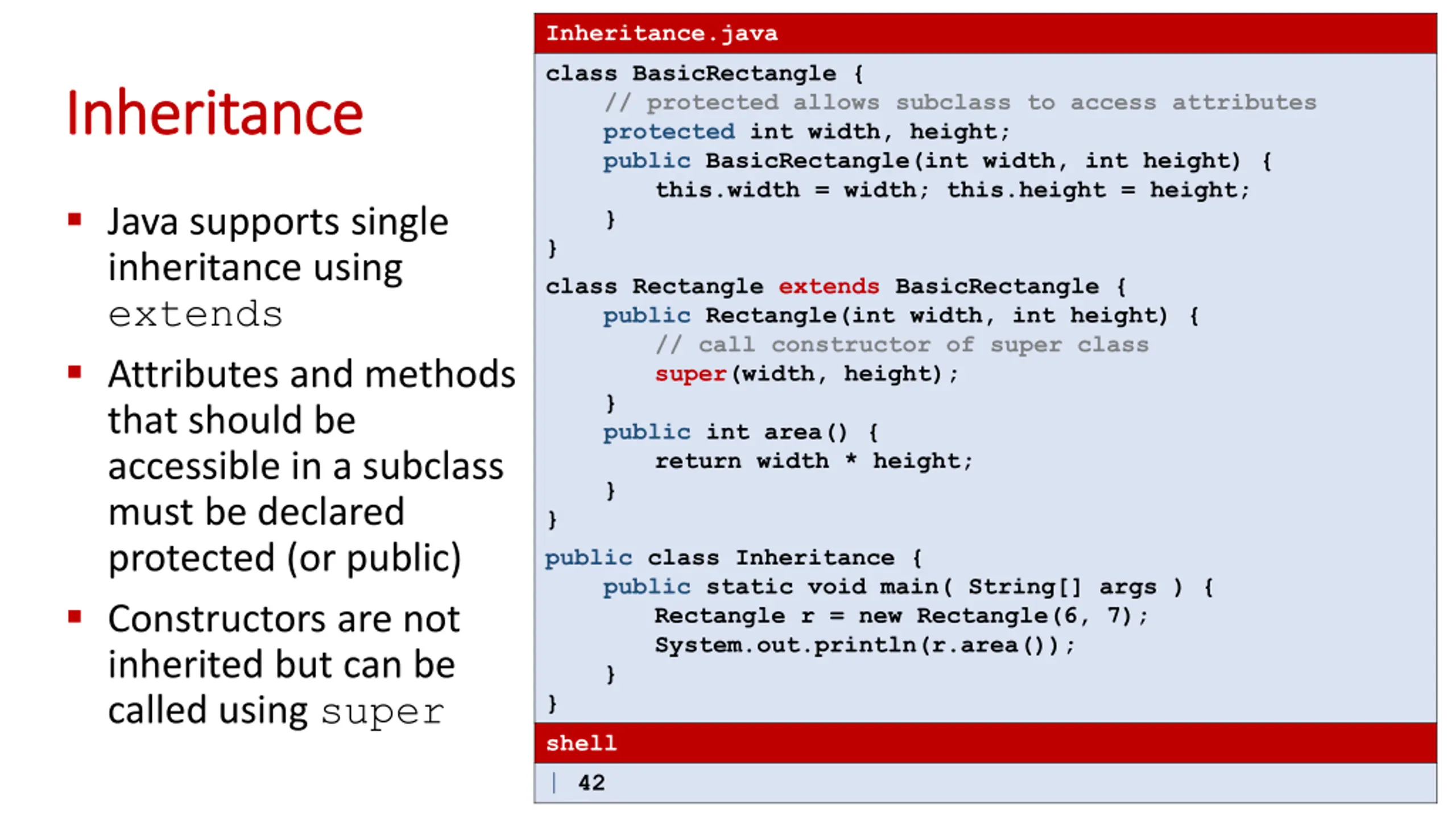 Inheritance.java class BasicRectangle { // protected allows subclass to access attributes protected int width, height; public BasicRectangle(int width, int height) { this.width = width; this.height = height; } } class Rectangle extends BasicRectangle { public Rectangle(int width, int height) { // call constructor of super class super(width, height); } public int area() { return width * height; } } public class Inheritance { public static void main( String[] args ) { Rectangle r = new Rectangle(6, 7); System.out.println(r.area()); } } Inheritance Inheritance Java supports single inheritance using extends Attributes and methods that should be accessible in a subclass must be declared protected (or public) Constructors are not inherited but can be called using super shell | 42