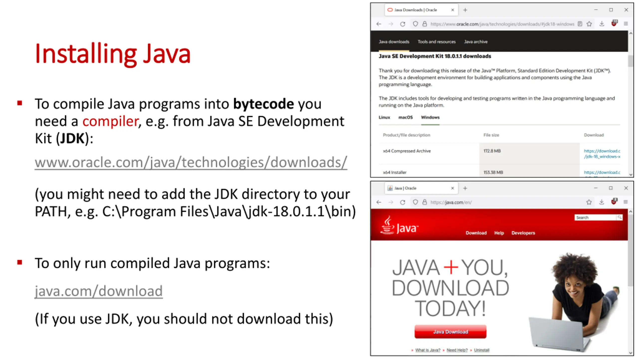 Installing Installing Java Java To compile Java programs into bytecode you need a compiler, e.g. from Java SE Development Kit (JDK): www.oracle.com/java/technologies/downloads/ (you might need to add the JDK directory to your PATH, e.g. C:\Program Files\Java\jdk-18.0.1.1\bin) To only run compiled Java programs: java.com/download (If you use JDK, you should not download this)