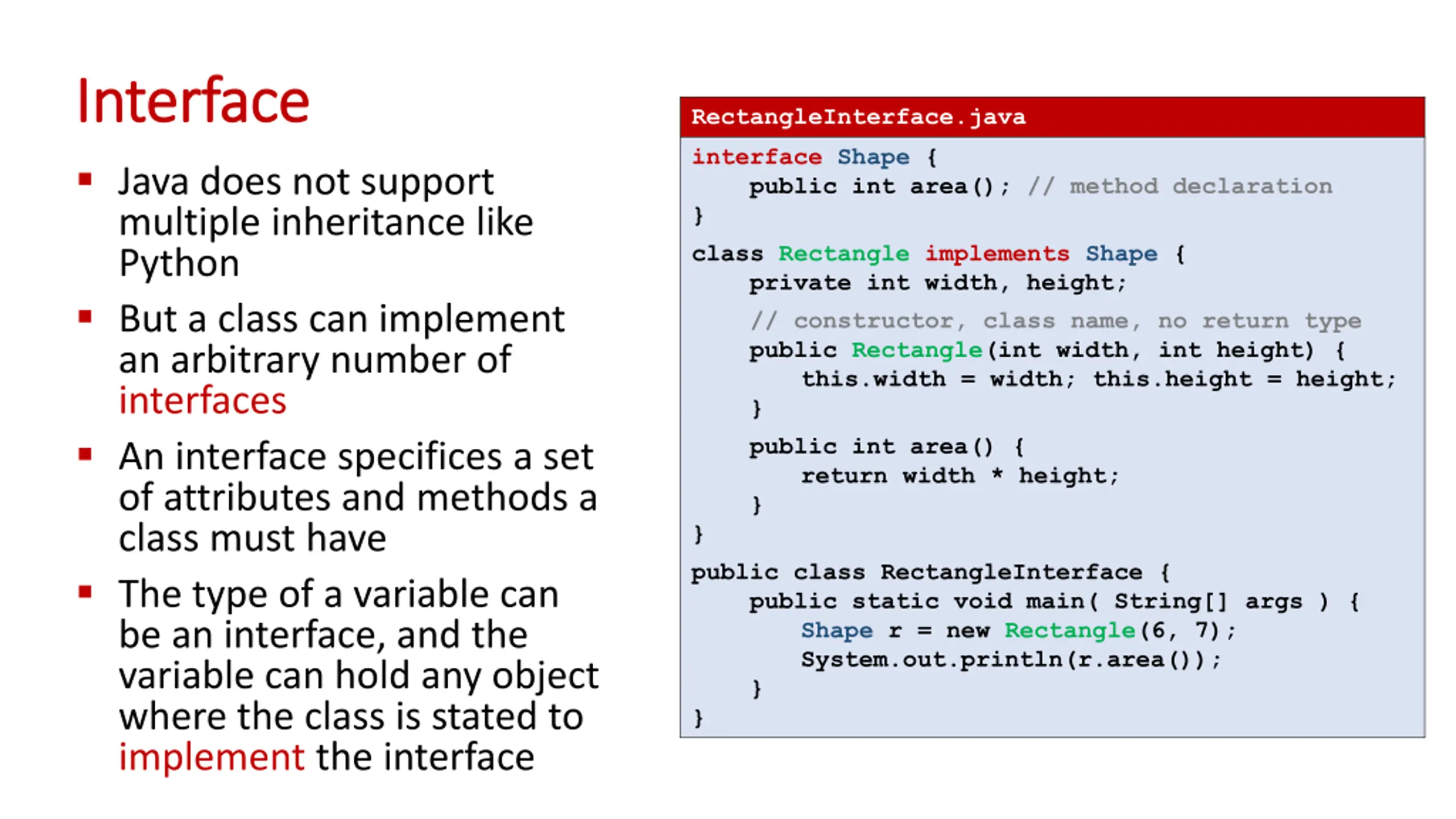 Interface Interface Java does not support multiple inheritance like Python But a class can implement an arbitrary number of interfaces An interface specifices a set of attributes and methods a class must have The type of a variable can be an interface, and the variable can hold any object where the class is stated to implement the interface RectangleInterface.java interface Shape { public int area(); // method declaration } class Rectangle implements Shape { private int width, height; // constructor, class name, no return type public Rectangle(int width, int height) { this.width = width; this.height = height; } public int area() { return width * height; } } public class RectangleInterface { public static void main( String[] args ) { Shape r = new Rectangle(6, 7); System.out.println(r.area()); } }