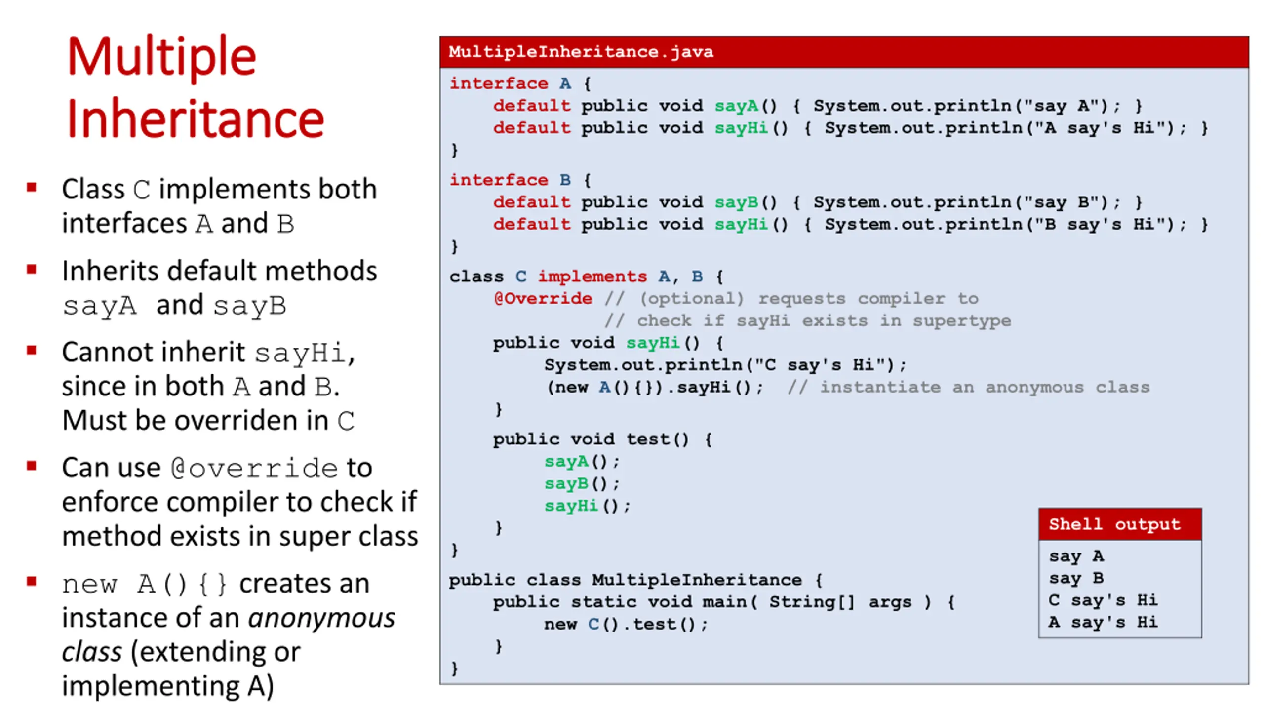 Multiple Multiple Inheritance Inheritance MultipleInheritance.java interface A { default public void sayA() { System.out.println("say A"); } default public void sayHi() { System.out.println("A say's Hi"); } } interface B { default public void sayB() { System.out.println("say B"); } default public void sayHi() { System.out.println("B say's Hi"); } } class C implements A, B { @Override // (optional) requests compiler to // check if sayHi exists in supertype public void sayHi() { System.out.println("C say's Hi"); (new A(){}).sayHi(); // instantiate an anonymous class } public void test() { sayA(); sayB(); sayHi(); } } public class MultipleInheritance { public static void main( String[] args ) { new C().test(); } } Class C implements both interfaces A and B Inherits default methods sayA and sayB Cannot inherit sayHi, since in both A and B. Must be overriden in C Can use @override to enforce compiler to check if method exists in super class new A(){} creates an instance of an anonymous class (extending or implementing A) Shell output say A say B C say's Hi A say's Hi