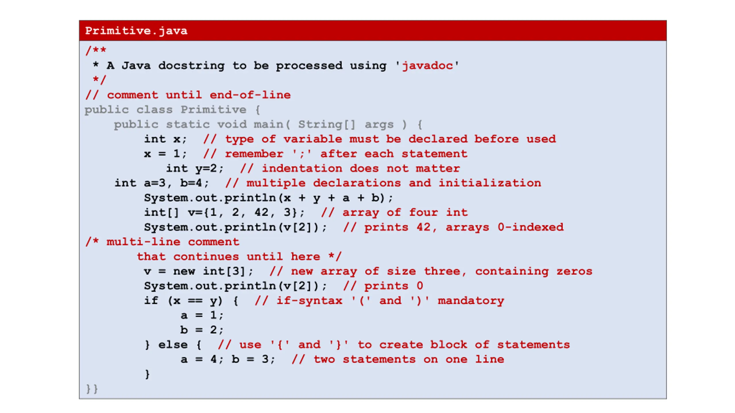 Primitive.java /** * A Java docstring to be processed using 'javadoc' */ // comment until end-of-line public class Primitive { public static void main( String[] args ) { int x; // type of variable must be declared before used x = 1; // remember ';' after each statement int y=2; // indentation does not matter int a=3, b=4; // multiple declarations and initialization System.out.println(x + y + a + b); int[] v={1, 2, 42, 3}; // array of four int System.out.println(v[2]); // prints 42, arrays 0-indexed /* multi-line comment that continues until here */ v = new int[3]; // new array of size three, containing zeros System.out.println(v[2]); // prints 0 if (x == y) { // if-syntax '(' and ')' mandatory a = 1; b = 2; } else { // use '{' and '}' to create block of statements a = 4; b = 3; // two statements on one line } }}