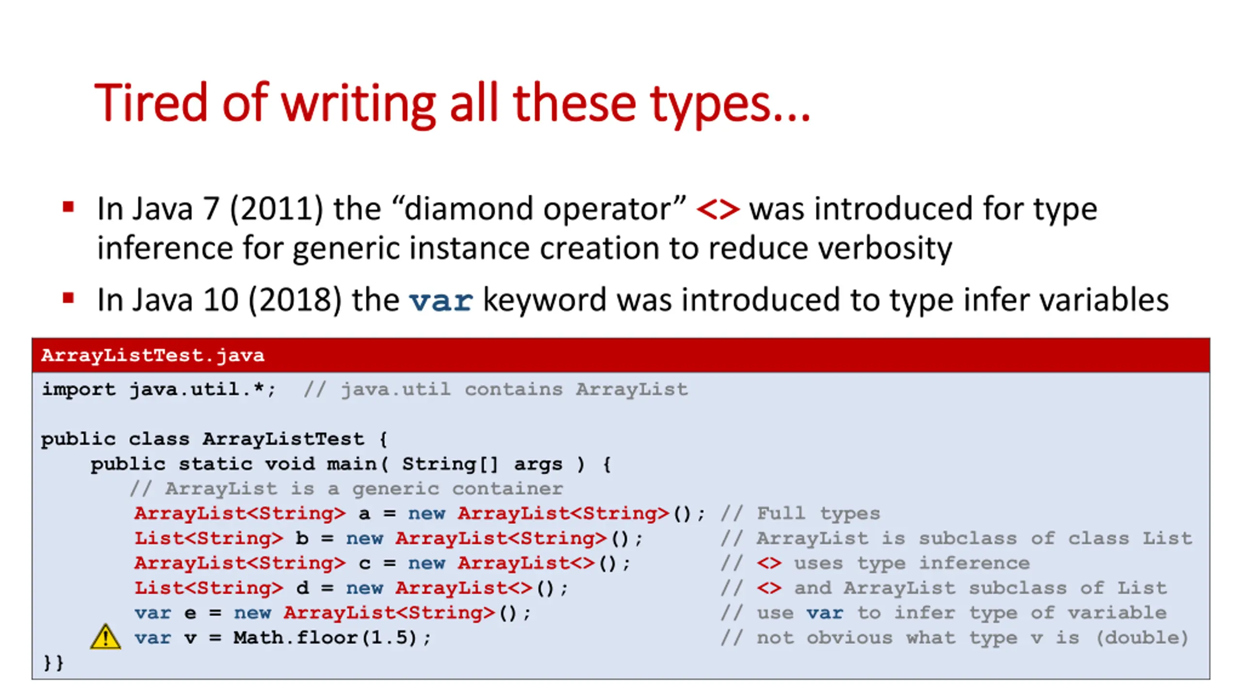 Tired Tired of of writing writing all all these these types... types... In Java 7 (2011) the diamond operator <> was introduced for type inference for generic instance creation to reduce verbosity In Java 10 (2018) the var keyword was introduced to type infer variables ArrayListTest.java import java.util.*; // java.util contains ArrayList public class ArrayListTest { public static void main( String[] args ) { // ArrayList is a generic container ArrayList<String> a = new ArrayList<String>(); // Full types List<String> b = new ArrayList<String>(); // ArrayList is subclass of class List ArrayList<String> c = new ArrayList<>(); // <> uses type inference List<String> d = new ArrayList<>(); // <> and ArrayList subclass of List var e = new ArrayList<String>(); // use var to infer type of variable var v = Math.floor(1.5); // not obvious what type v is (double) }}