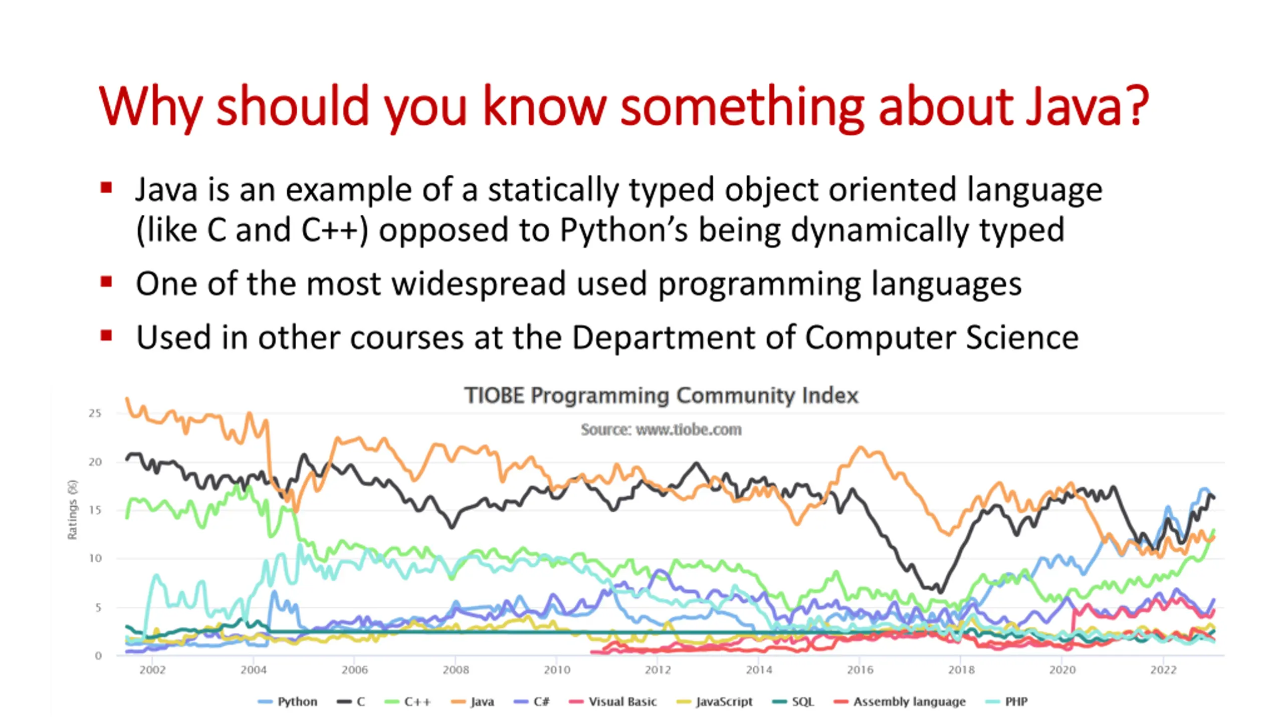 Why Why should should you you know know something something about about Java? Java? Java is an example of a statically typed object oriented language (like C and C++) opposed to Python s being dynamically typed One of the most widespread used programming languages Used in other courses at the Department of Computer Science