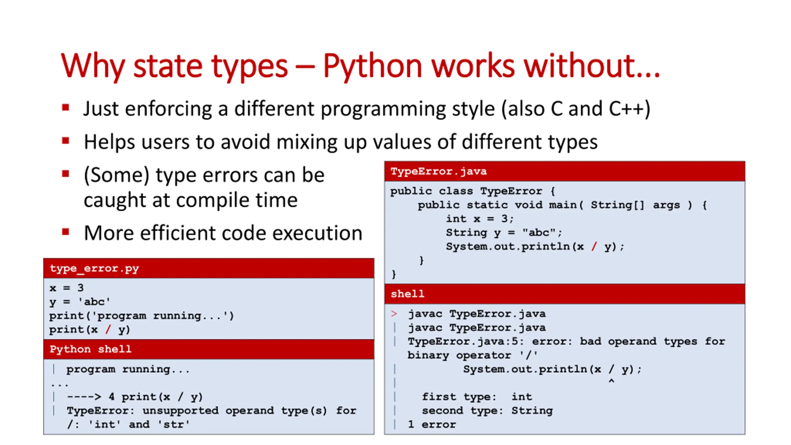 Why Why state Just enforcing a different programming style (also C and C++) Helps users to avoid mixing up values of different types (Some) type errors can be caught at compile time More efficient code execution state types types Python Python works works without without... ... TypeError.java public class TypeError { public static void main( String[] args ) { int x = 3; String y = "abc"; System.out.println(x / y); } } type_error.py x = 3 y = 'abc' print('program running...') print(x / y) shell > javac TypeError.java | javac TypeError.java | TypeError.java:5: error: bad operand types for binary operator '/' | System.out.println(x / y); | | first type: int | second type: String | 1 error Python shell | program running... ... | ----> 4 print(x / y) | TypeError: unsupported operand type(s) for /: 'int' and 'str' ^