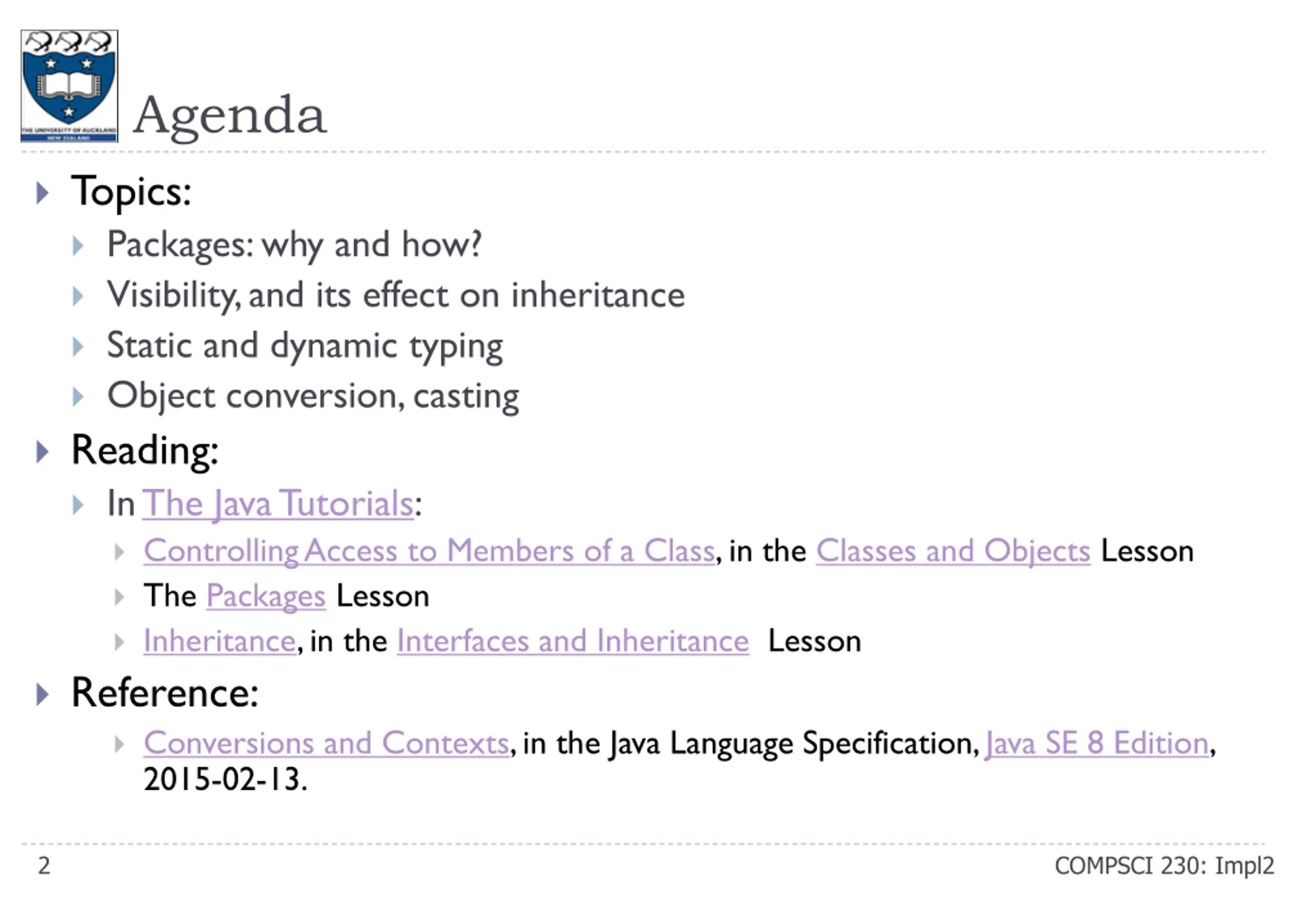 Agenda Topics: Packages: why and how? Visibility, and its effect on inheritance Static and dynamic typing Object conversion, casting Reading: In The Java Tutorials: Controlling Access to Members of a Class, in the Classes and Objects Lesson The Packages Lesson Inheritance, in the Interfaces and Inheritance Lesson Reference: Conversions and Contexts, in the Java Language Specification, Java SE 8 Edition, 2015-02-13. The Java Tutorials Controlling Access to Members of a Class Classes and Objects Packages Inheritance Interfaces and Inheritance Conversions and Contexts Java SE 8 Edition 2 COMPSCI 230: Impl2