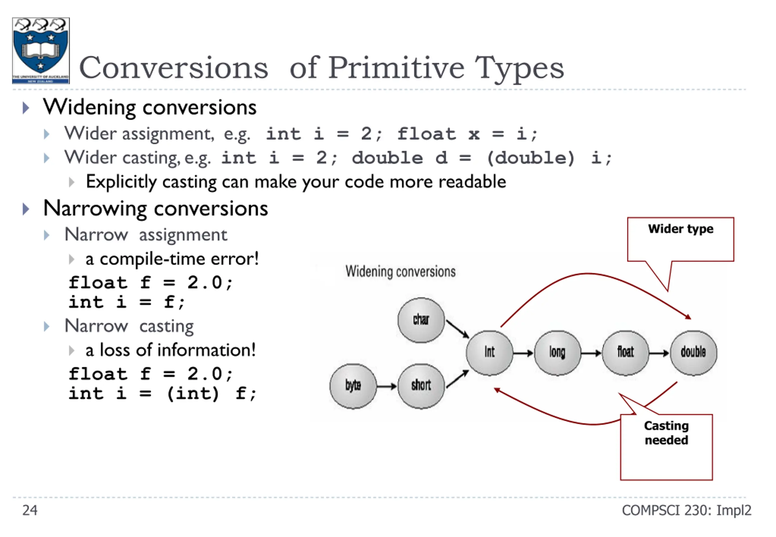 Conversions of Primitive Types Widening conversions Wider assignment, e.g. int i = 2; float x = i; Wider casting, e.g. int i = 2; double d = (double) i; Explicitly casting can make your code more readable Narrowing conversions Narrow assignment a compile-time error! float f = 2.0; int i = f; Narrow casting a loss of information! float f = 2.0; int i = (int) f; Wider type Casting needed 24 COMPSCI 230: Impl2