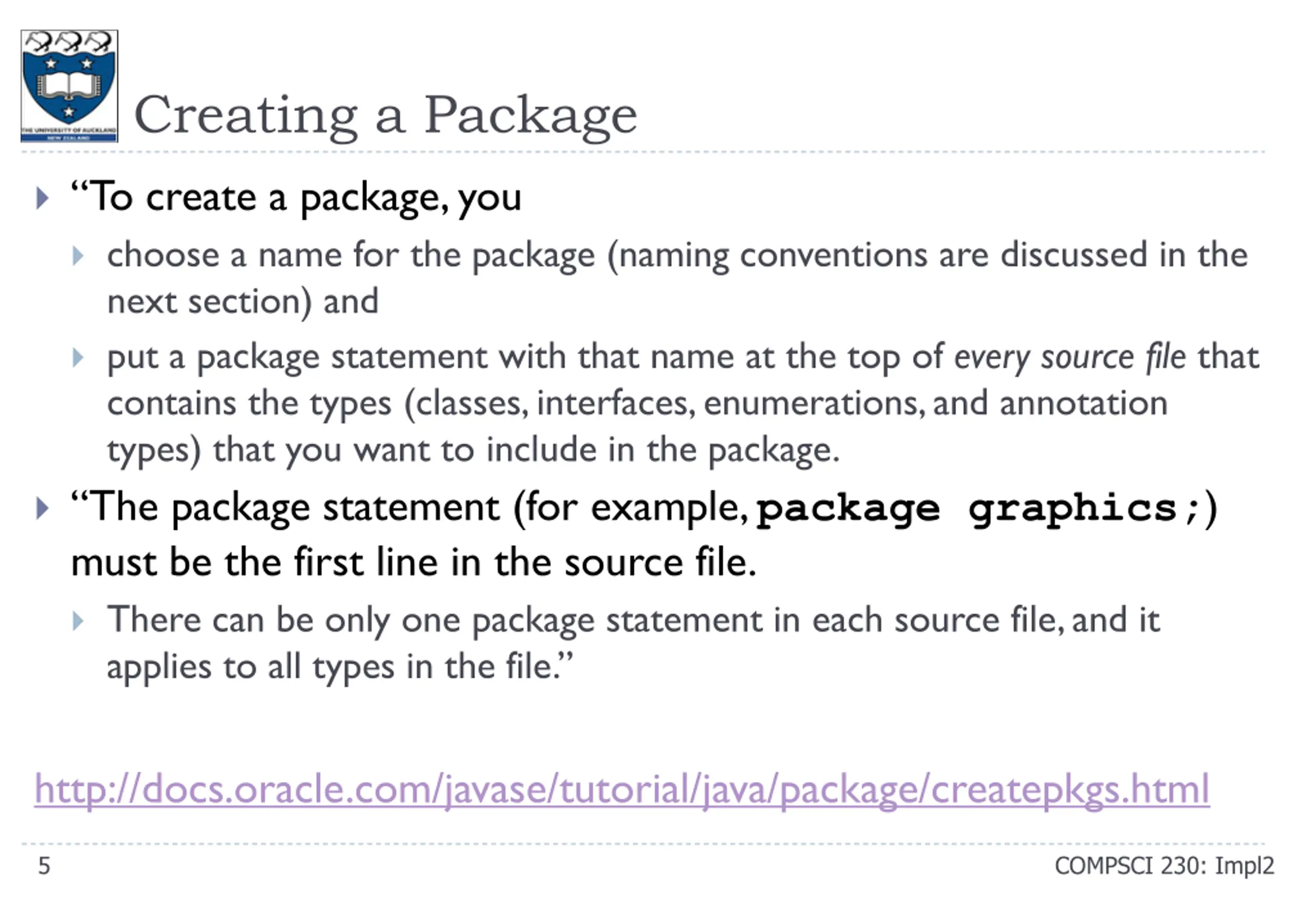Creating a Package To create a package, you choose a name for the package (naming conventions are discussed in the next section) and put a package statement with that name at the top of every source file that contains the types (classes, interfaces, enumerations, and annotation types) that you want to include in the package. The package statement (for example,package graphics;) must be the first line in the source file. There can be only one package statement in each source file, and it applies to all types in the file. http://docs.oracle.com/javase/tutorial/java/package/createpkgs.html 5 COMPSCI 230: Impl2
