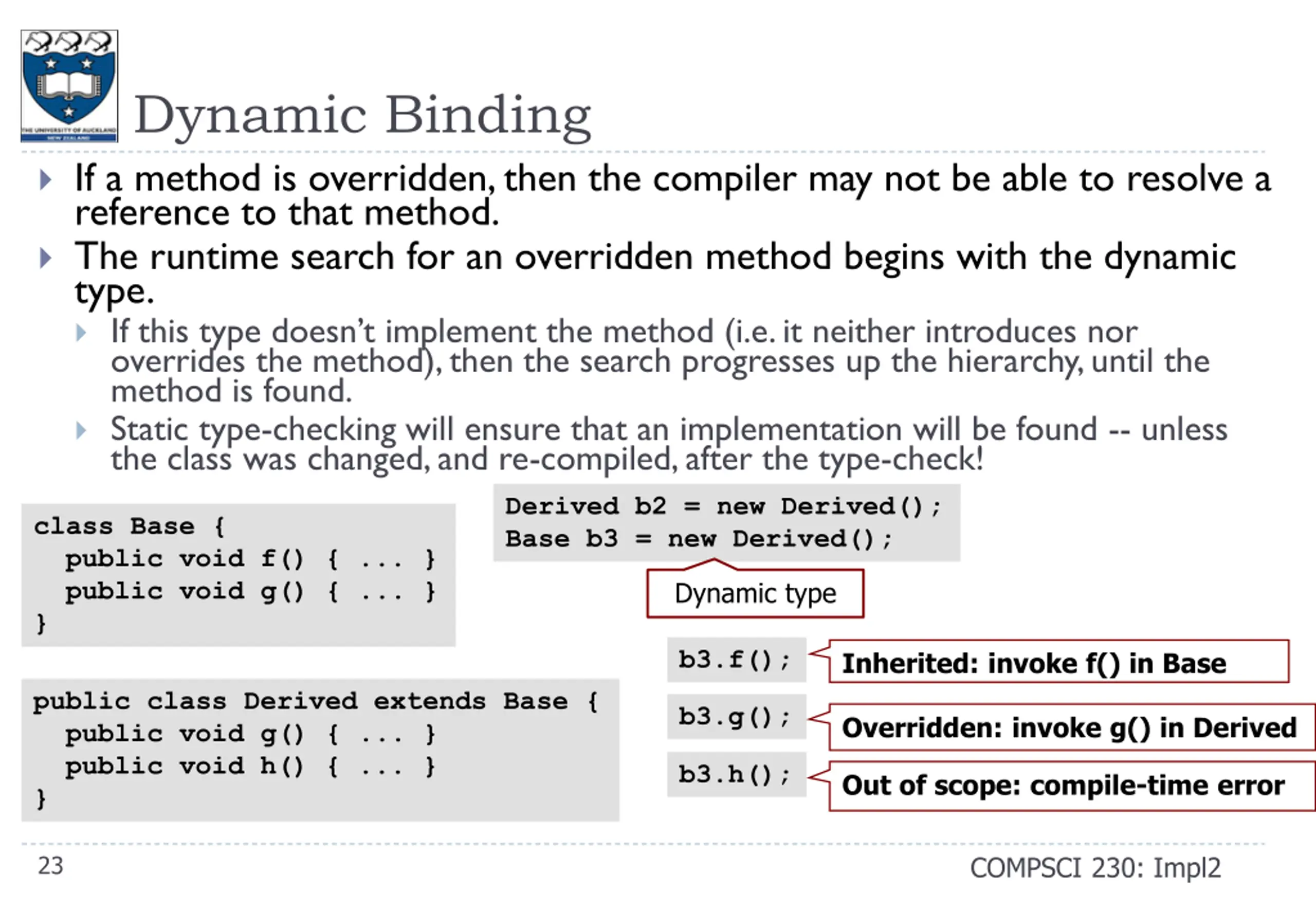 Dynamic Binding If a method is overridden, then the compiler may not be able to resolve a reference to that method. The runtime search for an overridden method begins with the dynamic type. If this type doesn t implement the method (i.e. it neither introduces nor overrides the method), then the search progresses up the hierarchy, until the method is found. Static type-checking ensures that an implementation will be found (unless the class was changed, and re-compiled, after the type-check.) Derived b2 = new Derived(); Base b3 = new Derived(); class Base { public void f() { ... } public void g() { ... } } Dynamic type b2.f(); Inherited: invoke f() in Base public class Derived extends Base { public void g() { ... } public void h() { ... } } b2.g(); Overridden: invoke g() in Derived b2.h(); Introduced: invoke h() in Derived 22 COMPSCI 230: Impl2