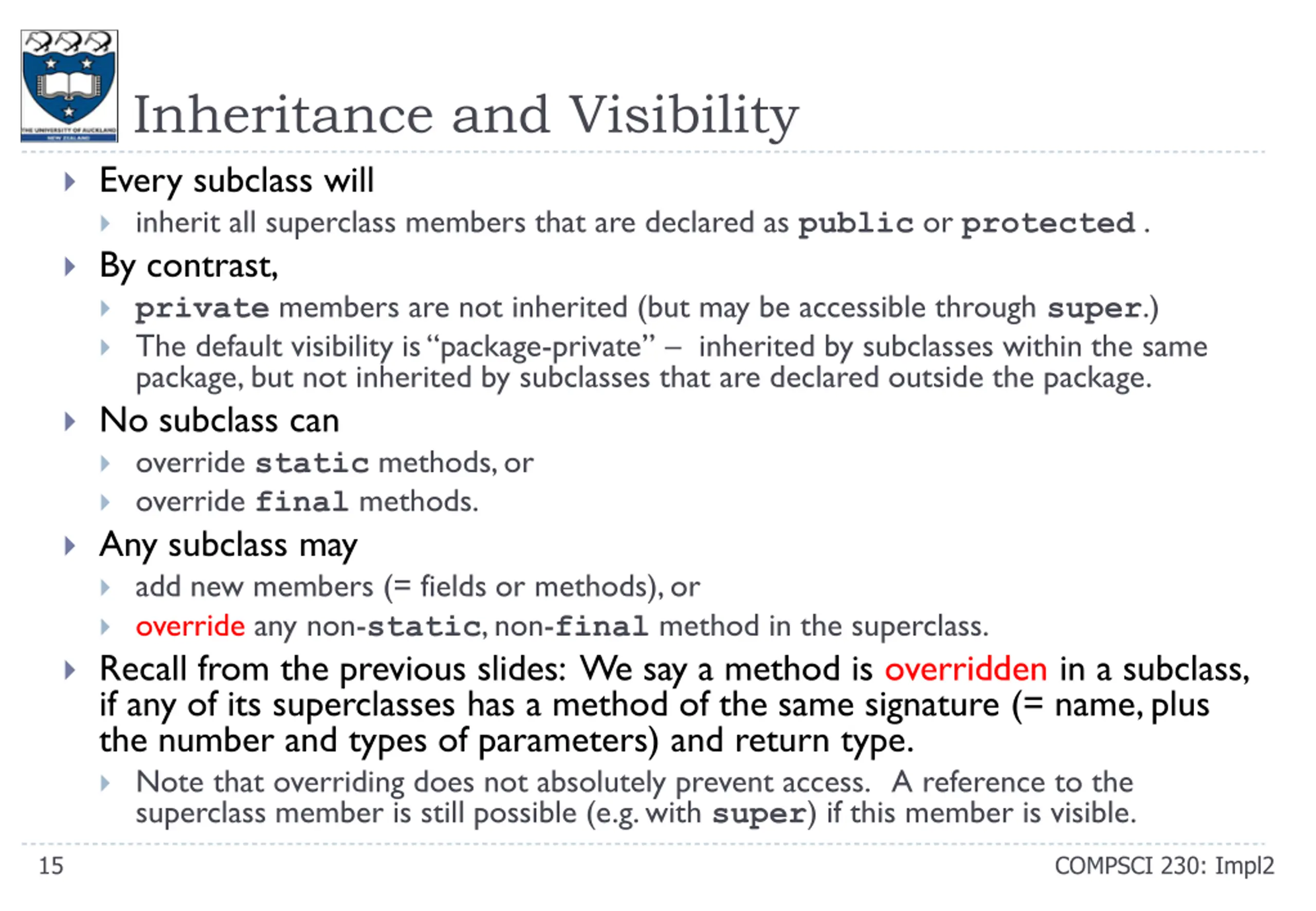 Inheritance and Visibility Every subclass will inherit all superclass members that are declared as publicor protected . By contrast, private members are not inherited (but may be accessible through super.) The default visibility is package-private inherited by subclasses within the same package, but not inherited by subclasses that are declared outside the package. No subclass can override static methods, or override final methods. Any subclass may add new members (= fields or methods), or override any non-static, non-final method in the superclass. Recall from the previous slides: We say a method is overridden in a subclass, if any of its superclasses has a method of the same signature (= name, plus the number and types of parameters) and return type. Note that overriding does not absolutely prevent access. A reference to the superclass member is still possible (e.g. with super) if this member is visible. 15 COMPSCI 230: Impl2