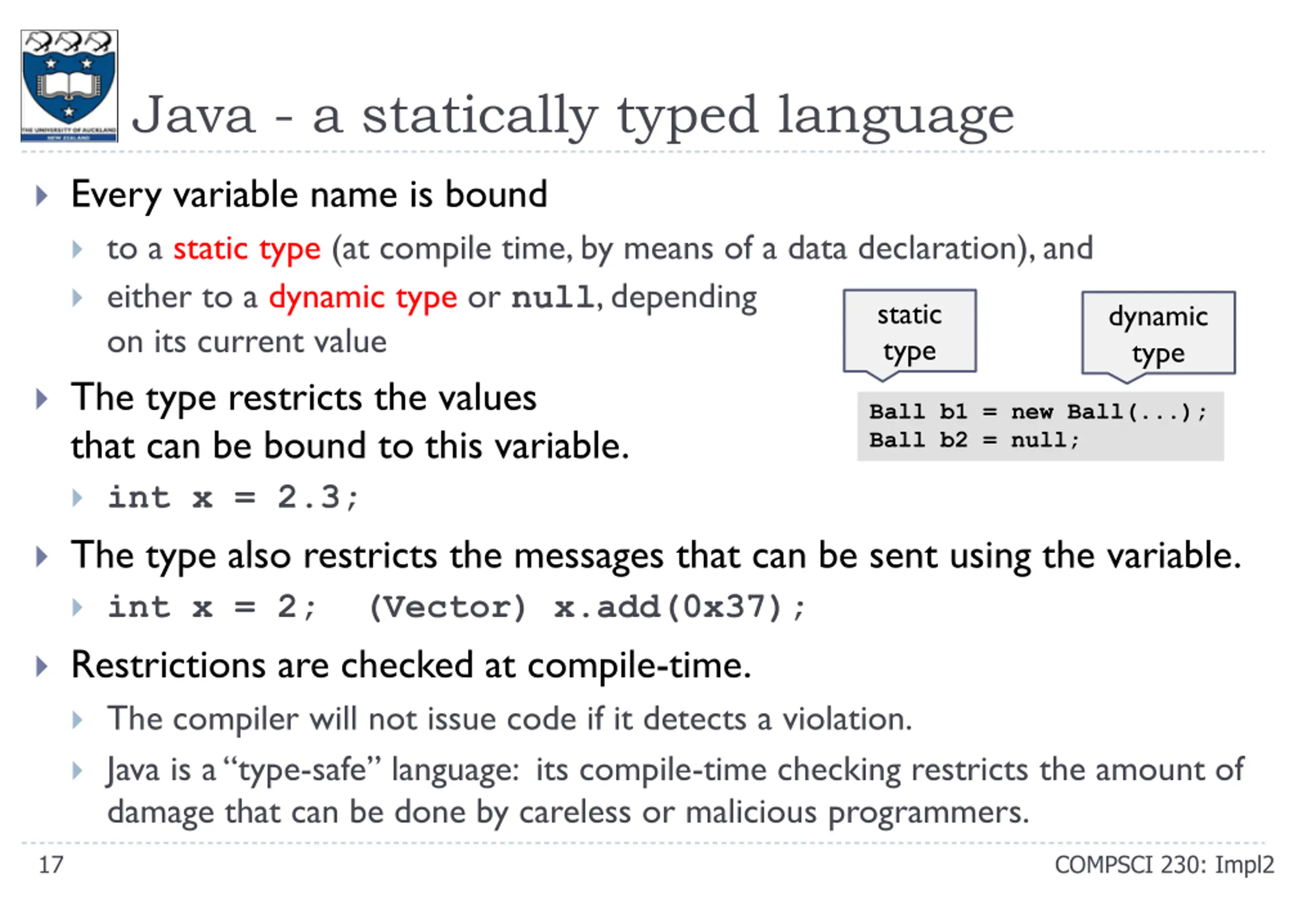 Java - a statically typed language Every variable name is bound to a static type (at compile time, by means of a data declaration), and either to a dynamic type or null, depending on its current value The type restricts the values that can be bound to this variable. int x = 2.3; The type also restricts the messages that can be sent using the variable. int x = 2; (Vector) x.add(0x37); Restrictions are checked at compile-time. The compiler will not issue code if it detects a violation. Java is a type-safe language: its compile-time checking restricts the amount of damage that can be done by careless or malicious programmers. static type dynamic type Ball b1 = new Ball(...); Ball b2 = null; 17 COMPSCI 230: Impl2