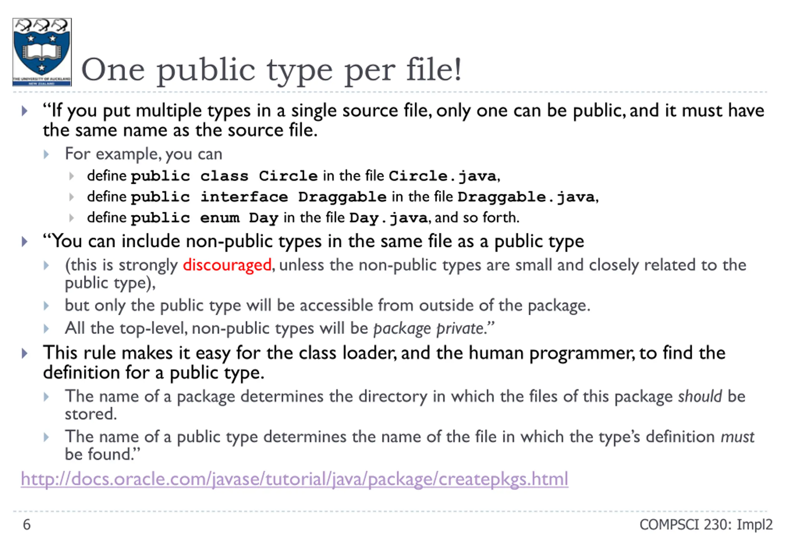 One public type per file! If you put multiple types in a single source file, only one can be public, and it must have the same name as the source file. For example, you can define public class Circle in the file Circle.java, define public interface Draggable in the file Draggable.java, define public enum Day in the file Day.java, and so forth. You can include non-public types in the same file as a public type (this is strongly discouraged, unless the non-public types are small and closely related to the public type), but only the public type will be accessible from outside of the package. All the top-level, non-public types will be package private. This rule makes it easy for the class loader, and the human programmer, to find the definition for a public type. The name of a package determines the directory in which the files of this package should be stored. The name of a public type determines the name of the file in which the type s definition must be found. http://docs.oracle.com/javase/tutorial/java/package/createpkgs.html 6 COMPSCI 230: Impl2