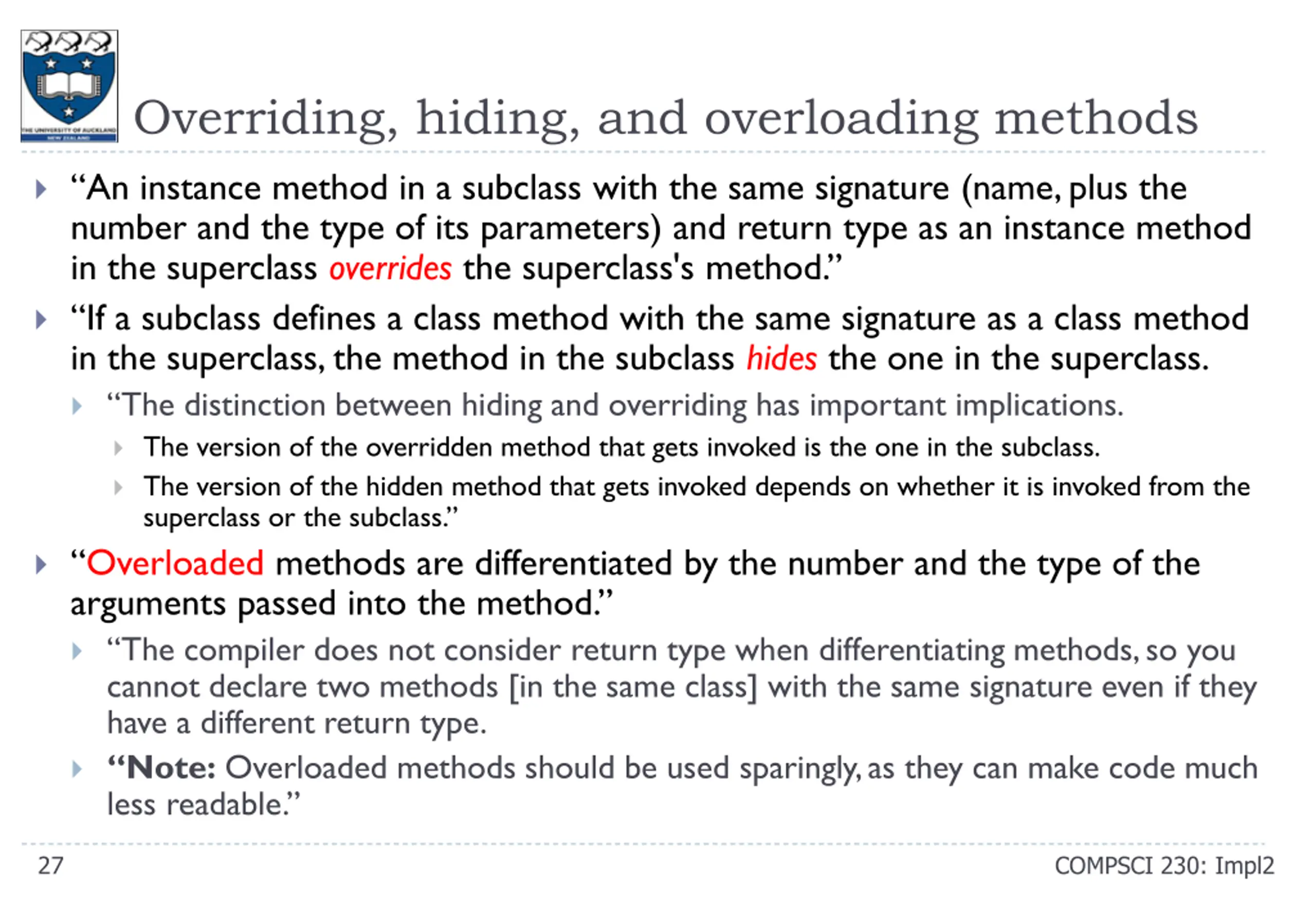 Overriding, hiding, and overloading methods An instance method in a subclass with the same signature (name, plus the number and the type of its parameters) and return type as an instance method in the superclass overrides the superclass's method. If a subclass defines a class method with the same signature as a class method in the superclass, the method in the subclass hides the one in the superclass. The distinction between hiding and overriding has important implications. The version of the overridden method that gets invoked is the one in the subclass. The version of the hidden method that gets invoked depends on whether it is invoked from the superclass or the subclass. Overloaded methods are differentiated by the number and the type of the arguments passed into the method. The compiler does not consider return type when differentiating methods, so you cannot declare two methods [in the same class] with the same signature even if they have a different return type. Note: Overloaded methods should be used sparingly, as they can make code much less readable. 27 COMPSCI 230: Impl2