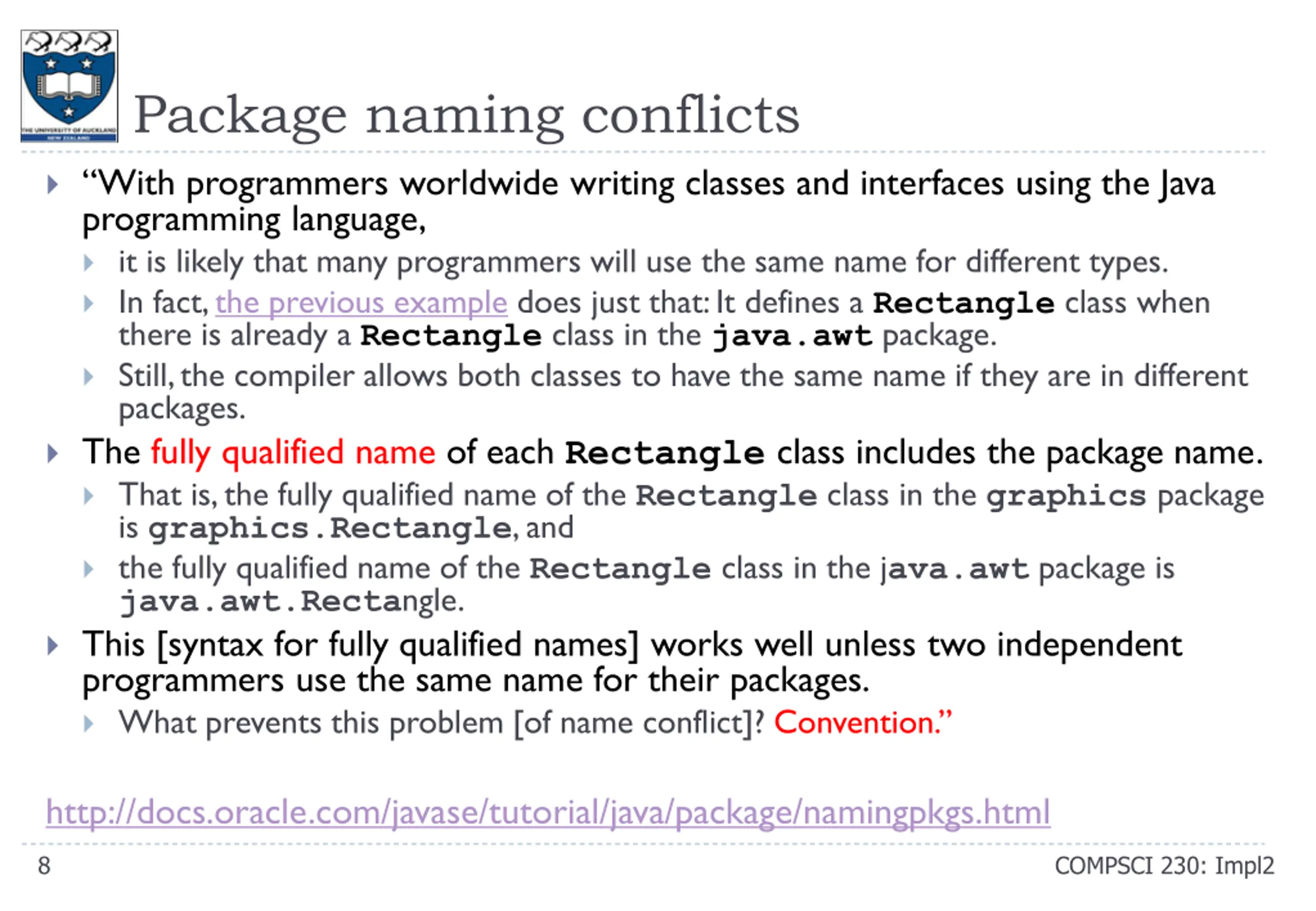 Package naming conflicts With programmers worldwide writing classes and interfaces using the Java programming language, it is likely that many programmers will use the same name for different types. In fact, the previous example does just that: It defines a Rectangle class when there is already a Rectangle class in the java.awt package. Still, the compiler allows both classes to have the same name if they are in different packages. The fully qualified name of each Rectangle class includes the package name. That is, the fully qualified name of the Rectangle class in the graphics package is graphics.Rectangle, and the fully qualified name of the Rectangle class in the java.awt package is java.awt.Rectangle. This [syntax for fully qualified names] works well unless two independent programmers use the same name for their packages. What prevents this problem [of name conflict]? Convention. http://docs.oracle.com/javase/tutorial/java/package/namingpkgs.html 8 COMPSCI 230: Impl2