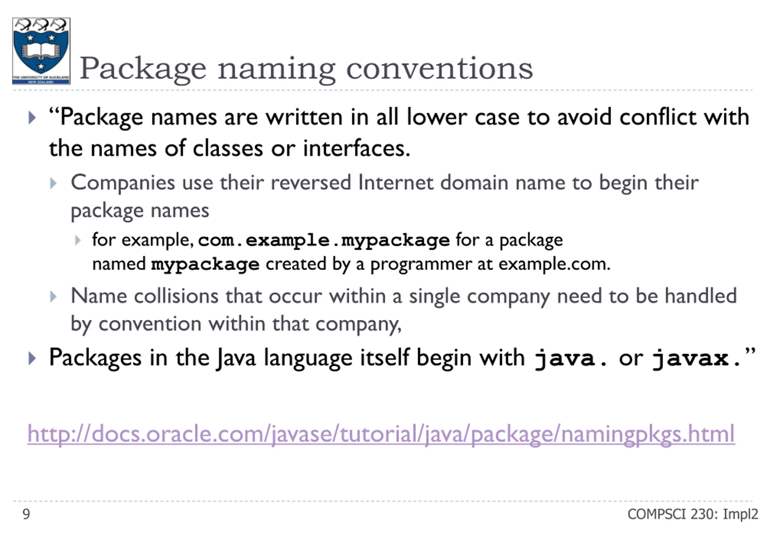 Package naming conventions Package names are written in all lower case to avoid conflict with the names of classes or interfaces. Companies use their reversed Internet domain name to begin their package names for example,com.example.mypackage for a package named mypackage created by a programmer at example.com. Name collisions that occur within a single company need to be handled by convention within that company, Packages in the Java language itself begin with java. or javax. http://docs.oracle.com/javase/tutorial/java/package/namingpkgs.html 9 COMPSCI 230: Impl2
