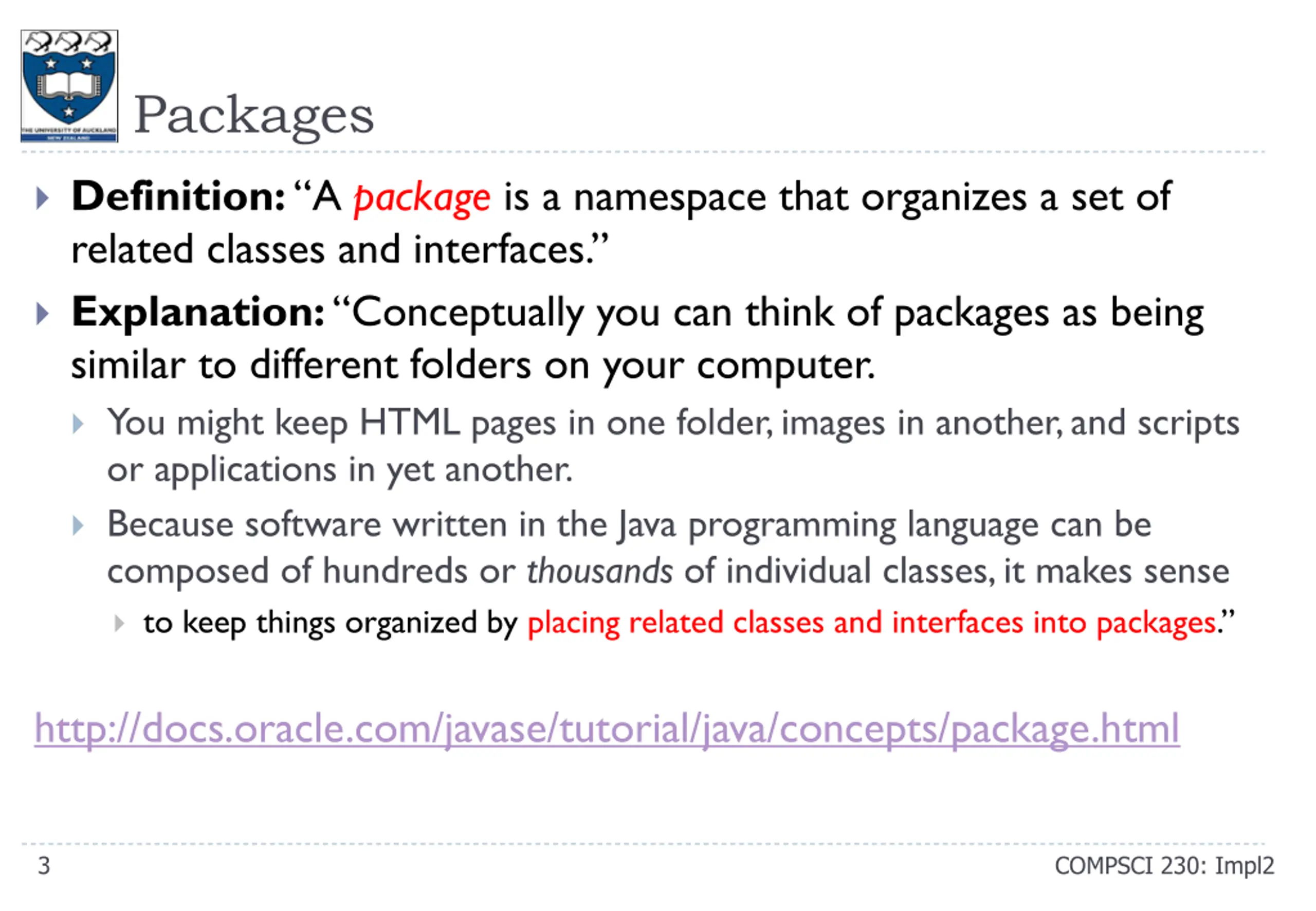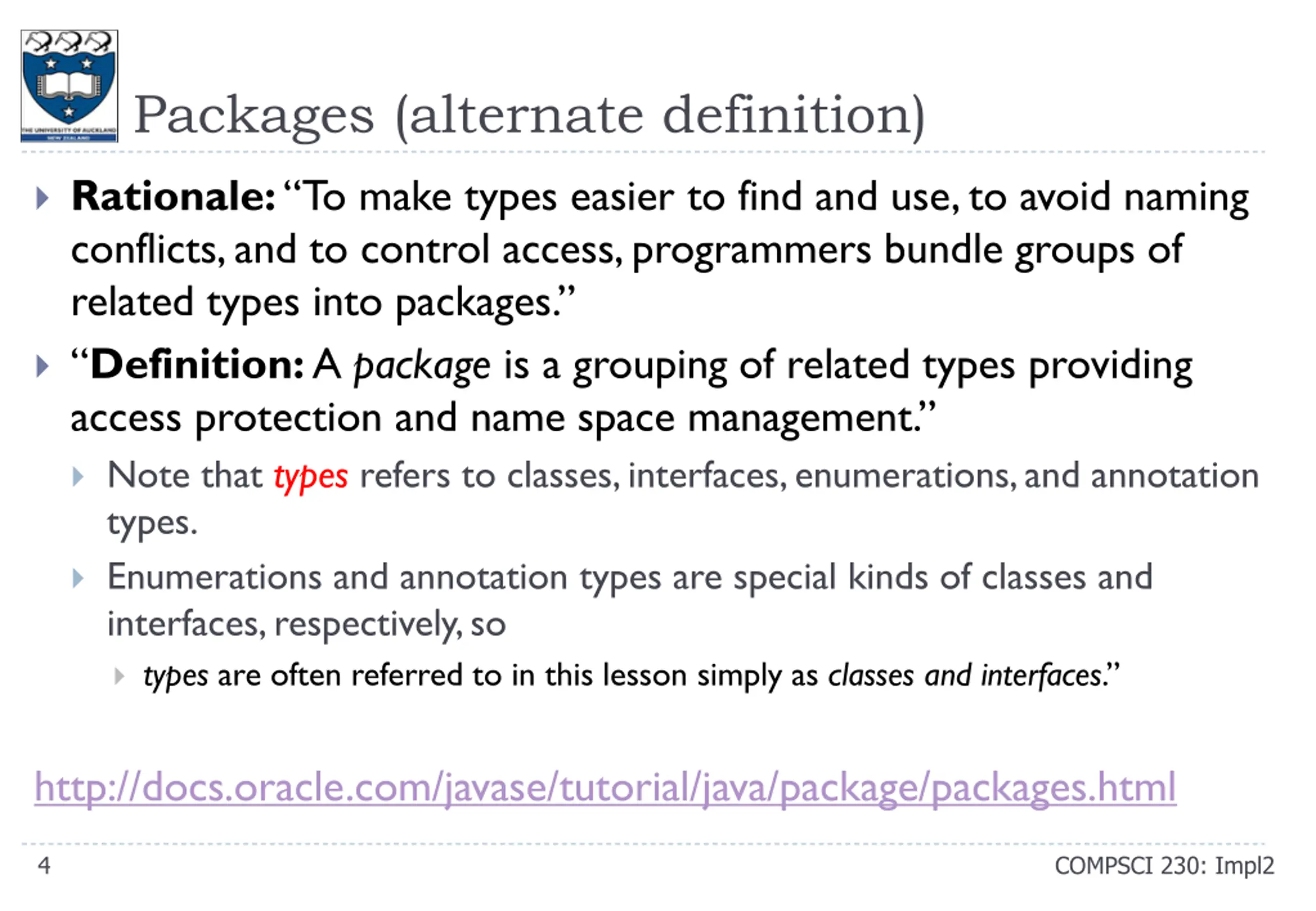 Packages Definition: A package is a namespace that organizes a set of related classes and interfaces. Explanation: Conceptually you can think of packages as being similar to different folders on your computer. You might keep HTML pages in one folder, images in another, and scripts or applications in yet another. Because software written in the Java programming language can be composed of hundreds or thousands of individual classes, it makes sense to keep things organized by placing related classes and interfaces into packages. http://docs.oracle.com/javase/tutorial/java/concepts/package.html 3 COMPSCI 230: Impl2