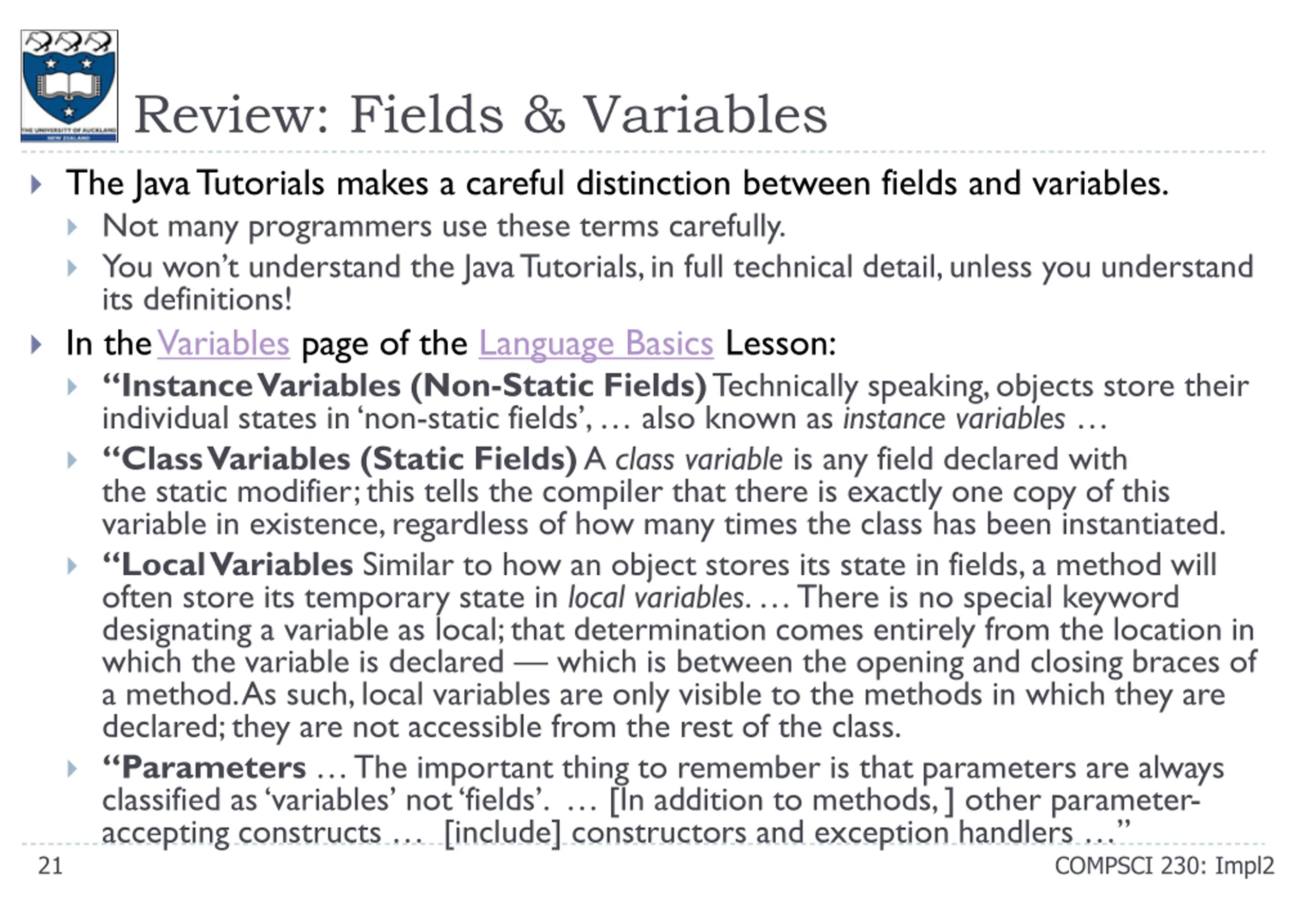 Review: Fields & Variables The Java Tutorials makes a careful distinction between fields and variables. Not many programmers use these terms carefully. You won t understand the Java Tutorials, in full technical detail, unless you understand its definitions! In the Variables page of the Language Basics Lesson: Instance Variables (Non-Static Fields)Technically speaking, objects store their individual states in non-static fields , also known as instance variables Class Variables (Static Fields)A class variable is any field declared with the static modifier; this tells the compiler that there is exactly one copy of this variable in existence, regardless of how many times the class has been instantiated. Local Variables Similar to how an object stores its state in fields, a method will often store its temporary state in local variables. There is no special keyword designating a variable as local; that determination comes entirely from the location in which the variable is declared which is between the opening and closing braces of a method. As such, local variables are only visible to the methods in which they are declared; they are not accessible from the rest of the class. Parameters The important thing to remember is that parameters are always classified as variables not fields . [In addition to methods, ] other parameter- accepting constructs [include] constructors and exception handlers 21 COMPSCI 230: Impl2