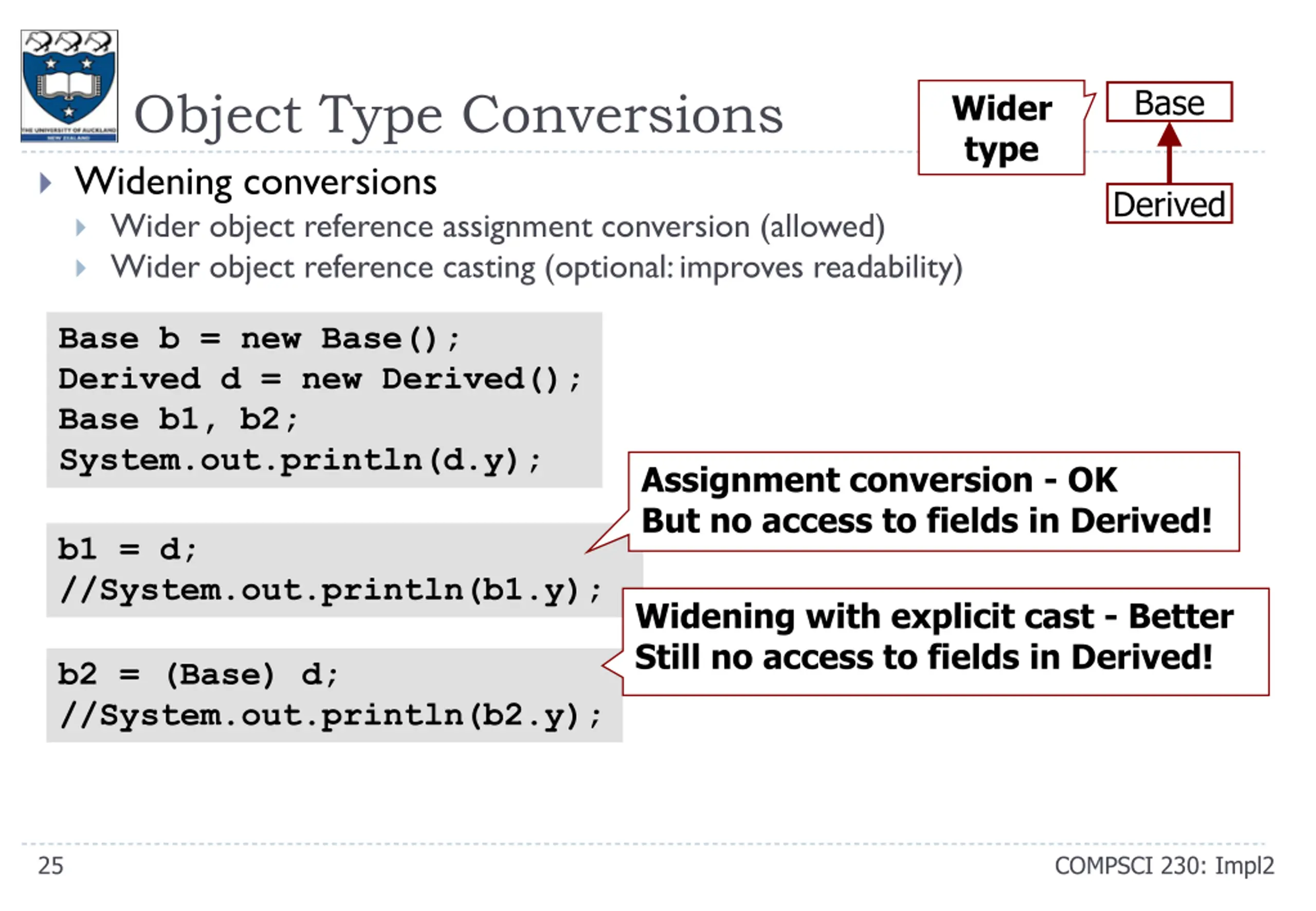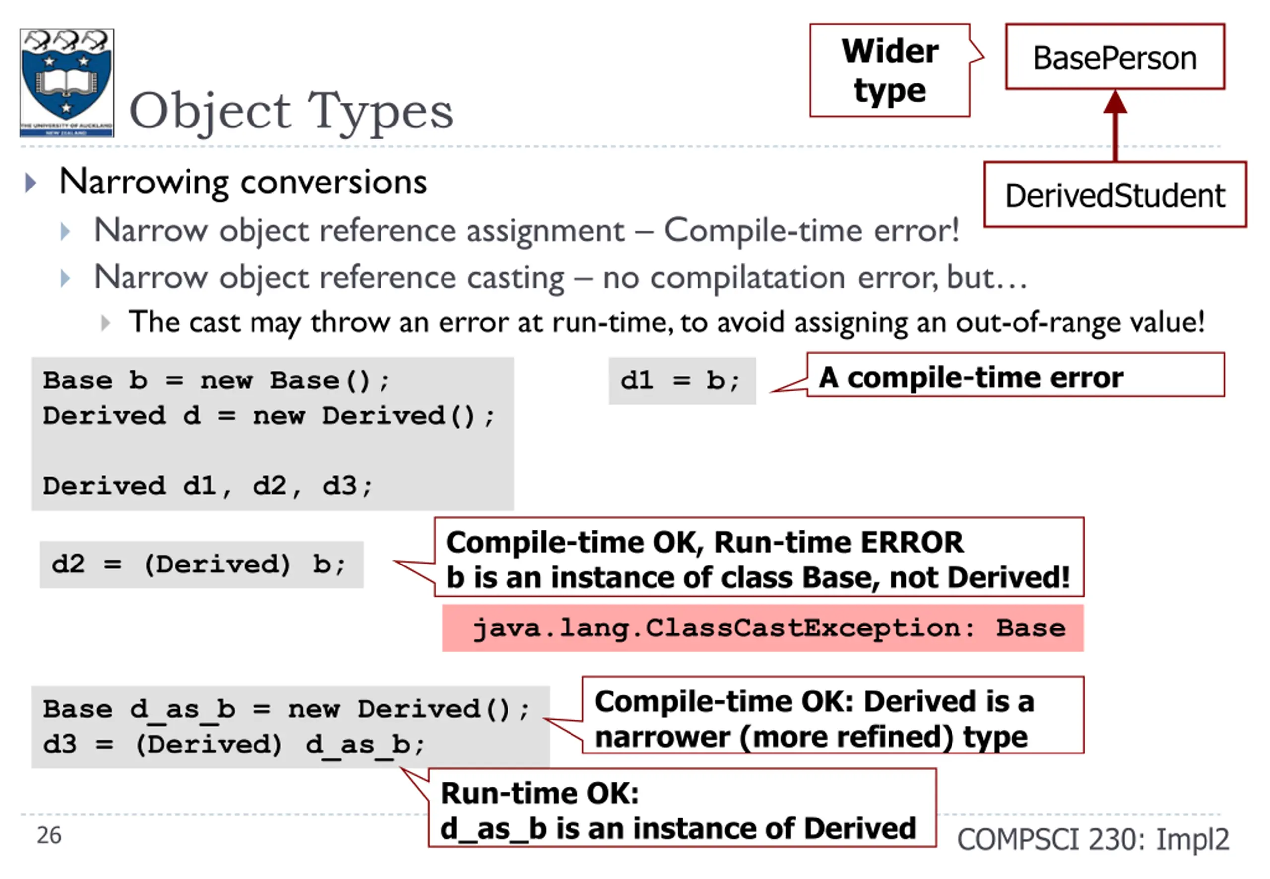 Base Object Type Conversions Widening conversions Wider object reference assignment conversion (allowed) Wider object reference casting (optional: improves readability) Wider type Derived Base b = new Base(); Derived d = new Derived(); Base b1, b2; System.out.println(d.y); Assignment conversion - OK But no access to fields in Derived! b1 = d; //System.out.println(b1.y); Widening with explicit cast - Better Still no access to fields in Derived! b2 = (Base) d; //System.out.println(b2.y); 25 COMPSCI 230: Impl2