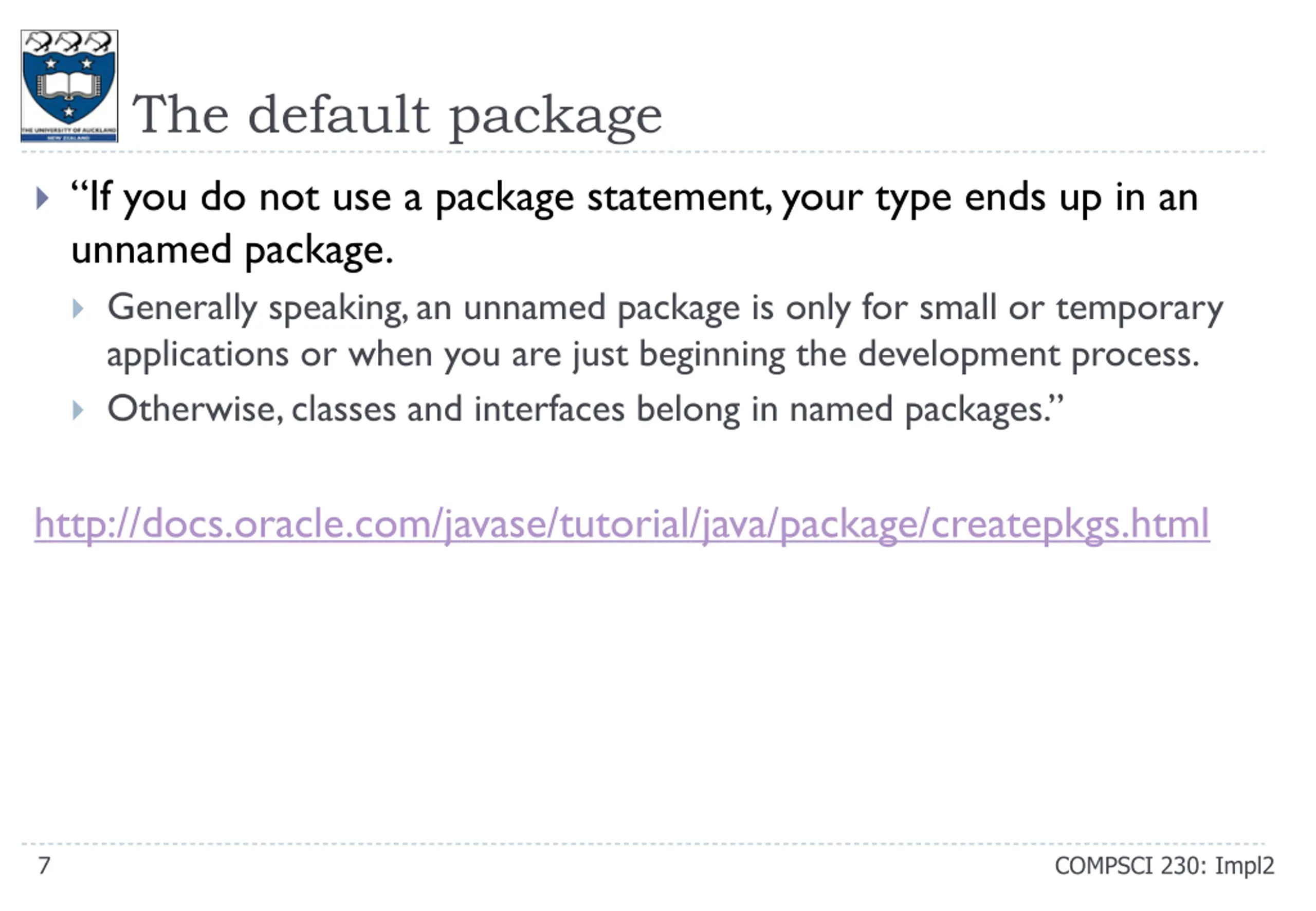The default package If you do not use a package statement, your type ends up in an unnamed package. Generally speaking, an unnamed package is only for small or temporary applications or when you are just beginning the development process. Otherwise, classes and interfaces belong in named packages. http://docs.oracle.com/javase/tutorial/java/package/createpkgs.html 7 COMPSCI 230: Impl2