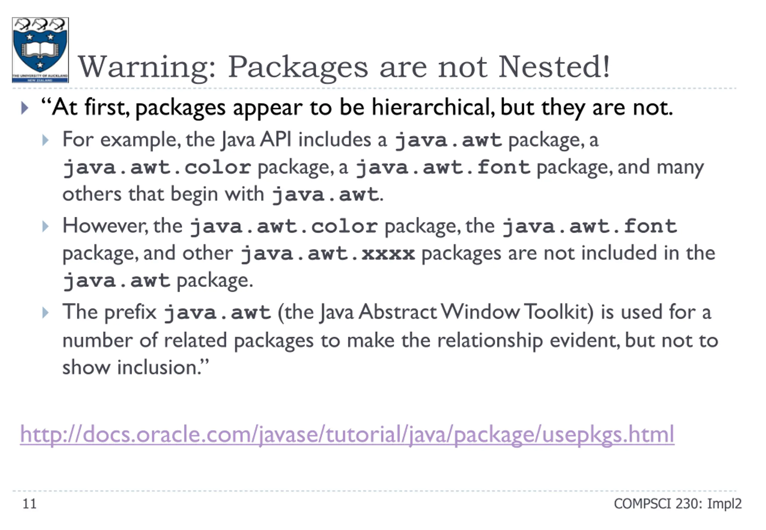 External references To use a public package member from outside its package, you must do one of the following: Refer to the member by its fully qualified name Import the package member Import the member s entire package. The fully qualified name for class C in package p is p.C To import class C from package p, you write import p.C [This allows you to refer to the class as C rather than p.C] To import an entire package p, you write import p.* Each is appropriate for different situations If you import a package which defines a class C then your code may refer to it by its simple name, rather than its fully-qualified name, unless this name is ambiguous: If a member in one package shares its name with a member in another package and both packages are imported, you must refer to each member by its qualified name. http://docs.oracle.com/javase/tutorial/java/package/usepkgs.html 10 COMPSCI 230: Impl2