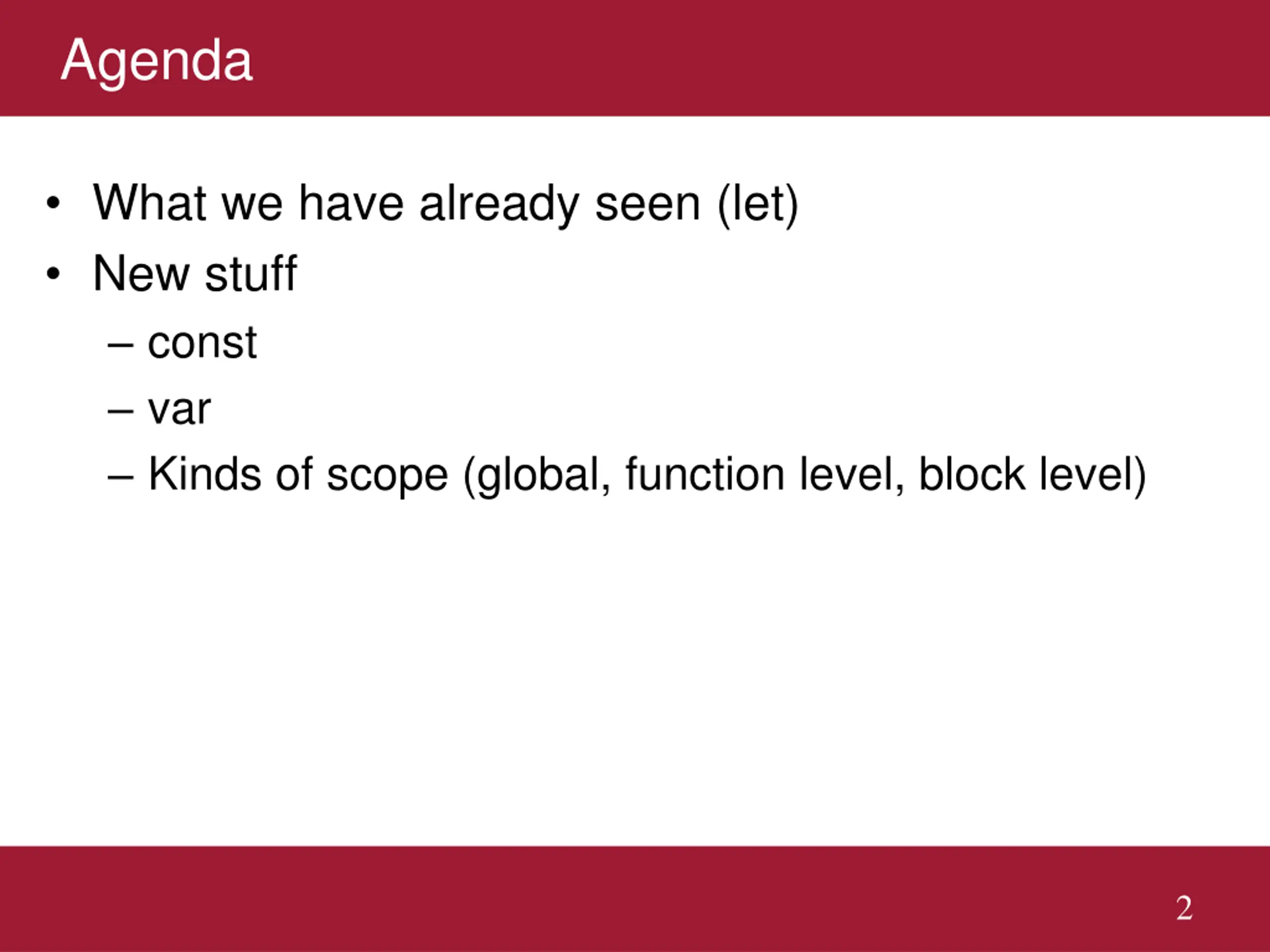 Agenda What we have already seen (let) New stuff const var Kinds of scope (global, function level, block level) 2
