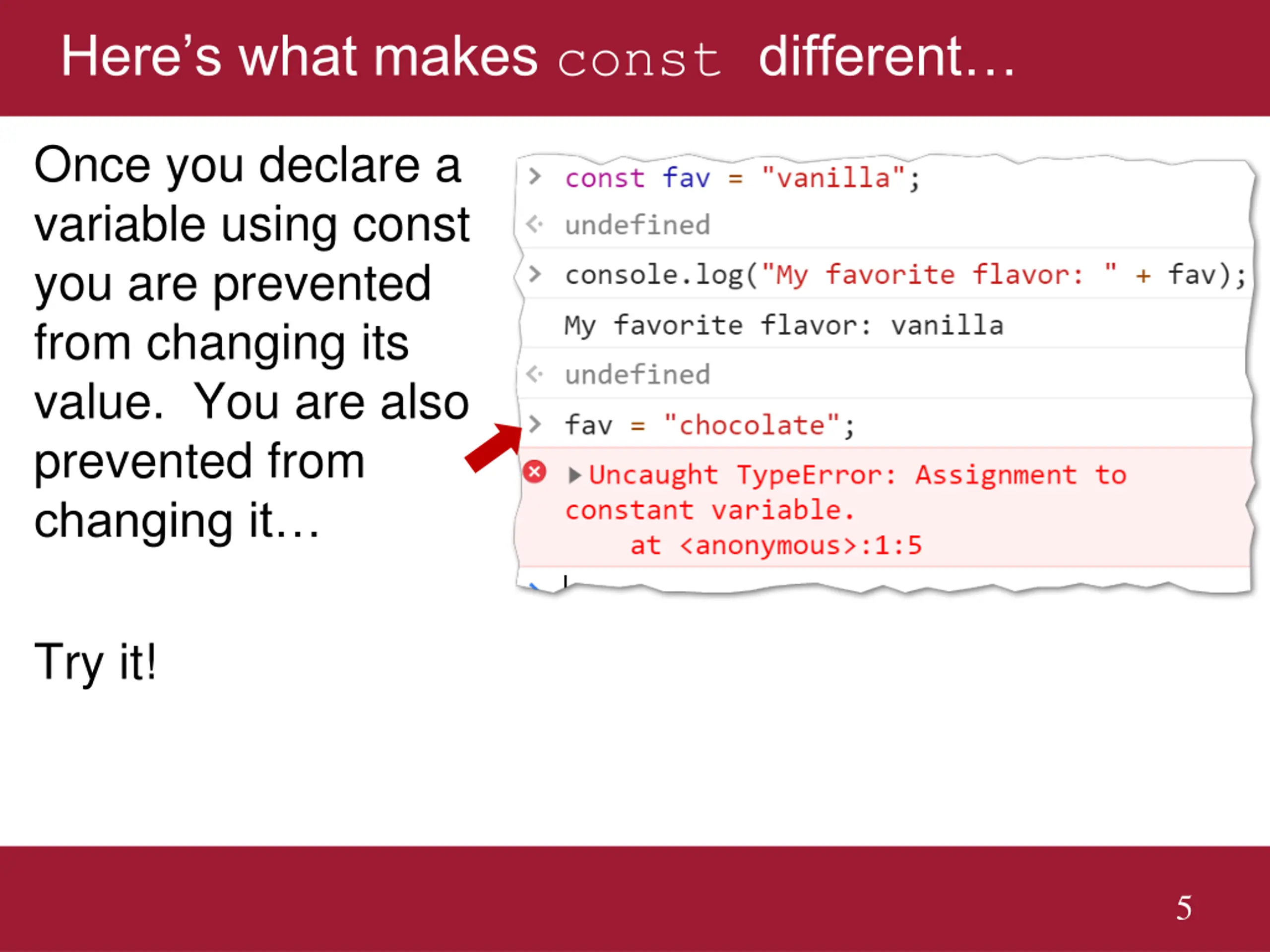 Heres what makes const different Once you declare a variable using const you are prevented from changing its value. You are also prevented from changing it Try it! 5