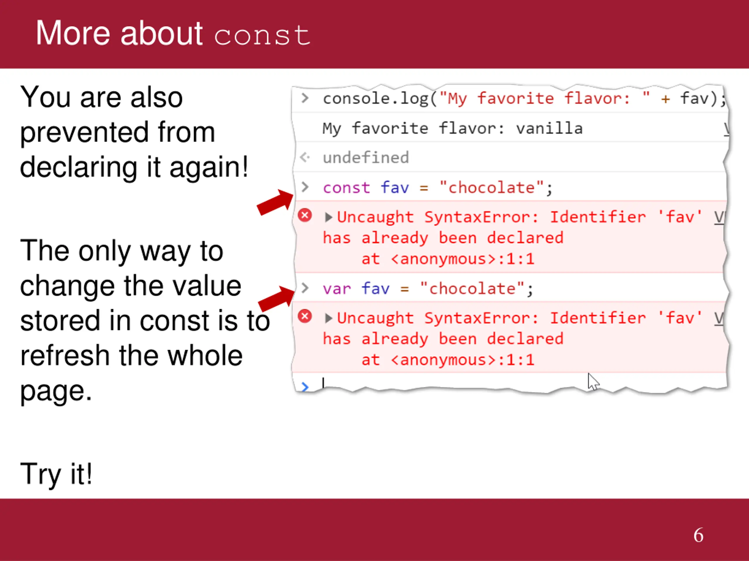 More about const You are also prevented from declaring it again! The only way to change the value stored in const is to refresh the whole page. Try it! 6