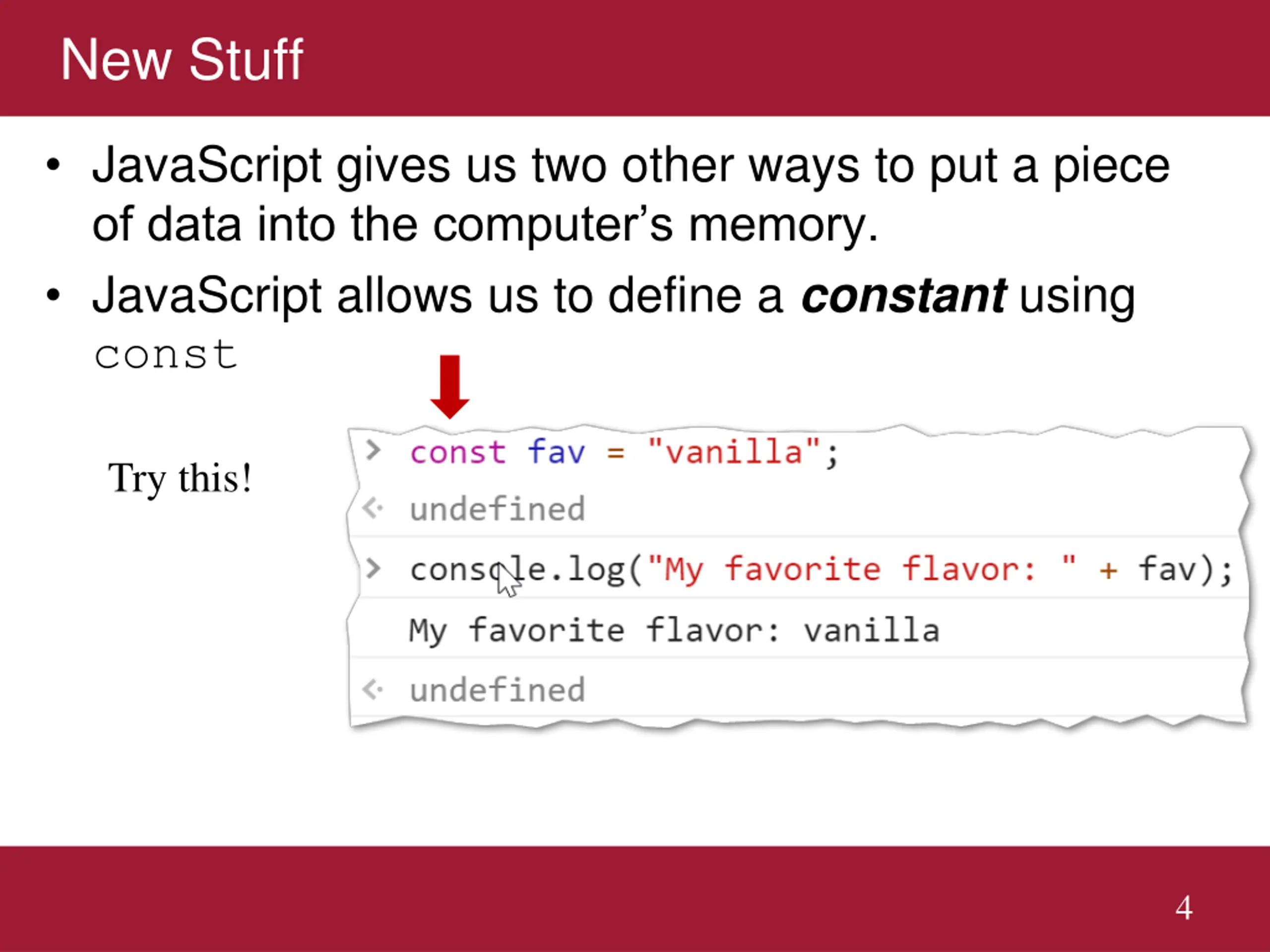 New Stuff JavaScript gives us two other ways to put a piece of data into the computer s memory. JavaScript allows us to define a constant using const Try this! 4