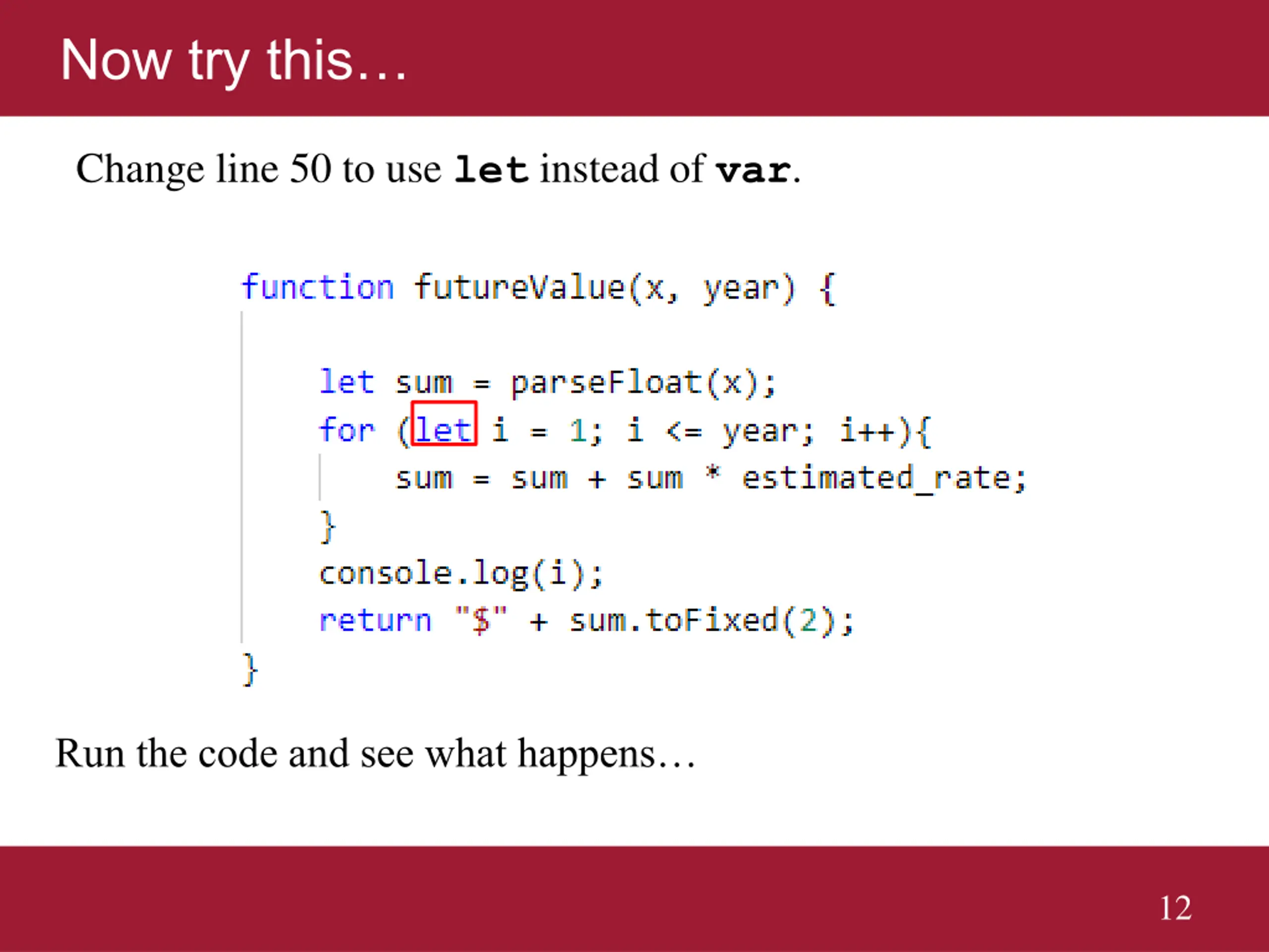 Now try this Change line 50 to use let instead of var. Run the code and see what happens 12